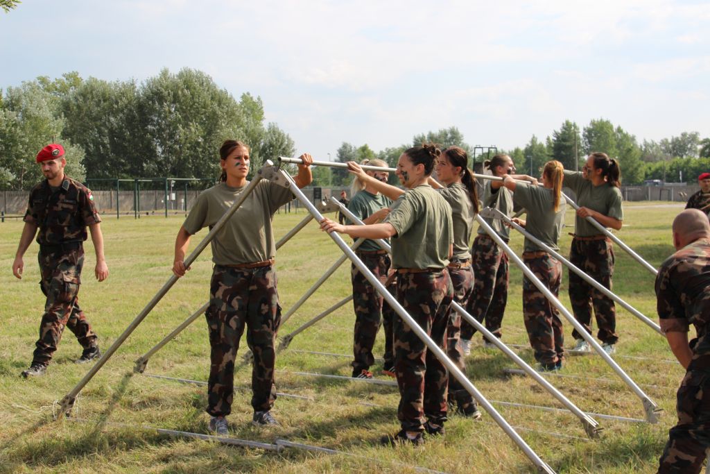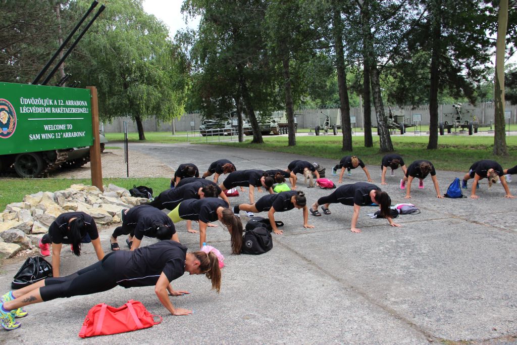 A tréning során tizenöt állomással, feladattal készültek a szervezők a laktanya sport- és akadálypályáján, valamint a látogató parkban. Az eligazítást követően azonnal katonaruhába öltöztek a sportolók, akiknek az arcán látszott, hogy egyáltalán nincs ínyükre a dolog. Az egyenruhában a kézilabdázóknak még közösen kellett sátrat állítaniuk, amennyiben a program végén vacsorázni is akartak valahol. A feladatot teljesítve, a lányok két csapatban indultak tovább kiképzőikkel, hogy végig küzdjék magukat a rájuk váró kihívásokon, úgy, mint a gépjármű tolás, lőszeres láda cipelés, sebesültszállítás, miközben végig „lőttek” rájuk. Majd átkúsztak egy légvédelmi rakéta indítóállvány4 (KUB) alatt, kézigránátot dobtak, táraztak, gyakorolták a fegyver szét- és összeszerelését. Repeszálló mellényben emeltek padot, tornáztak, majd leküzdötték az akadálypályát, légpuskával lőttek célba, magukra öltötték a vegyvédelmi ruhát és felvették a gázálarcot is. Az utolsó feladat az alaki foglalkozás volt, ahol meneteltek és felkészültek az elöljáróval való találkozásra.