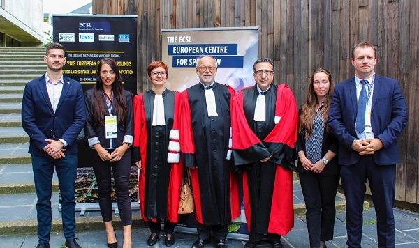 A csapat és az európai döntő bírói tanácsa, Prof. María del Carmen Muñoz Rodríguez, Prof. Armel Kerrest és Marco Ferrazzani, az Európai Űrügynökség jogi osztályának vezetője.