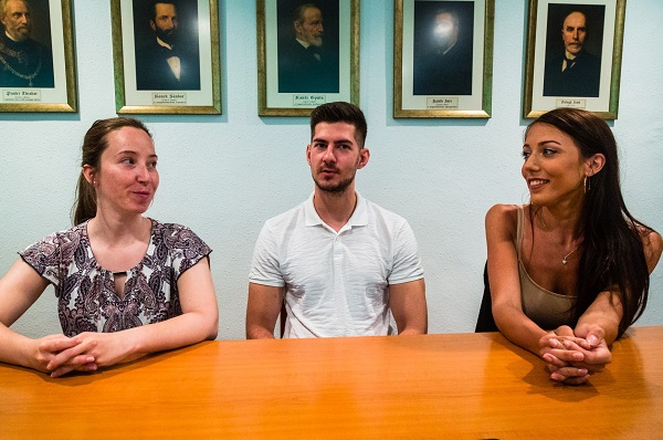 Horváth Rebeka, Frank Máté és Mihály Laura Dominika már újra itthon, Győrben, a jogi kar Deák-termében. Fotó: Májer Csaba József
