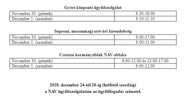 A NAV Győr-Moson-Sopron Megyei Adó- és Vámigazgatósága ügyfélszolgálatainak ügyfélfogadási rendje változik a decemberi ünnepnapok körüli munkarendváltozásra való tekintettel.
