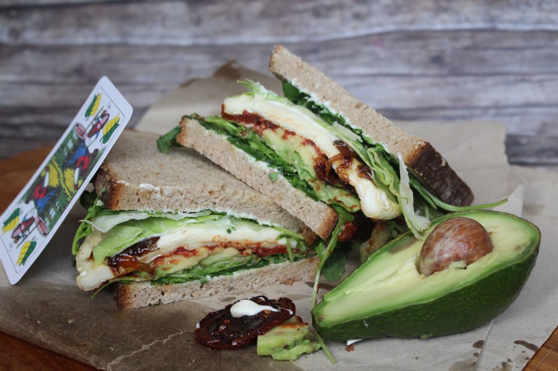 2- Vajjal kenjük, jégsalátát halmozunk rá, paradicsompürét kenünk erre, majd az avokádót, a cheddar sajt szeleteket.
