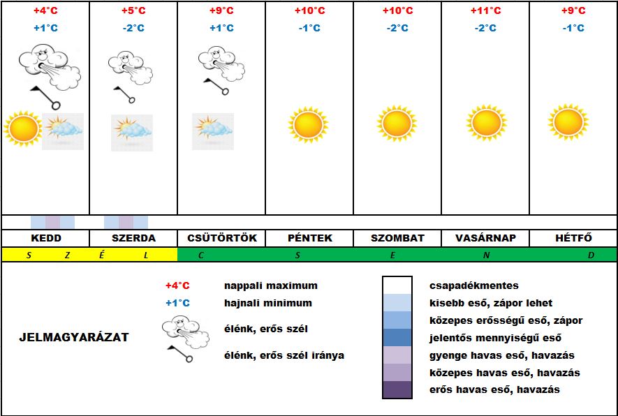 Még szerdán is sok lesz felettünk a felhő, a szél azonban jelentősen mérséklődik, futó zápor, hózápor még lehet. Csütörtöktől aztán egy igen stabil magas nyomású képződmény helyeződik fölénk, mely tartós 1030 hPa nyomást biztosítva hétfőig egész biztosan vendégünk lesz. A szél szinte teljesen elül, hajnalban képződhet pára vagy köd. A délelőtt folyamán azonban ezek hamar feloszlanak, s péntektől egy ferde tengelyű, nyújtott ómega belsejében szinte zavartalan lesz a napsütés. A hajnali órákban lehetnek gyenge fagyok, de napközben +10°C körüli értékek várhatók.