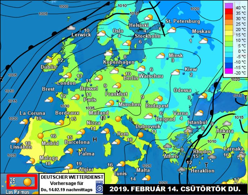 A 3. ábra csütörtöki előrejelzésén az anticiklon centruma Németország felett van, s ha elfelejtjük becsukni a szemünket, akkor még azt is láthatjuk, hogy Las Palmasban, a Kanári-szigeteken aznap +25°C lesz. Erre még gondolni is „szörnyű”. A 4. ábra azt a ferde tengelyű ómegát mutatja, melynek centrumában Magyarországon is tombolni fog a napsütés. Hogy mikor fog még visszatérni a tél? Később.