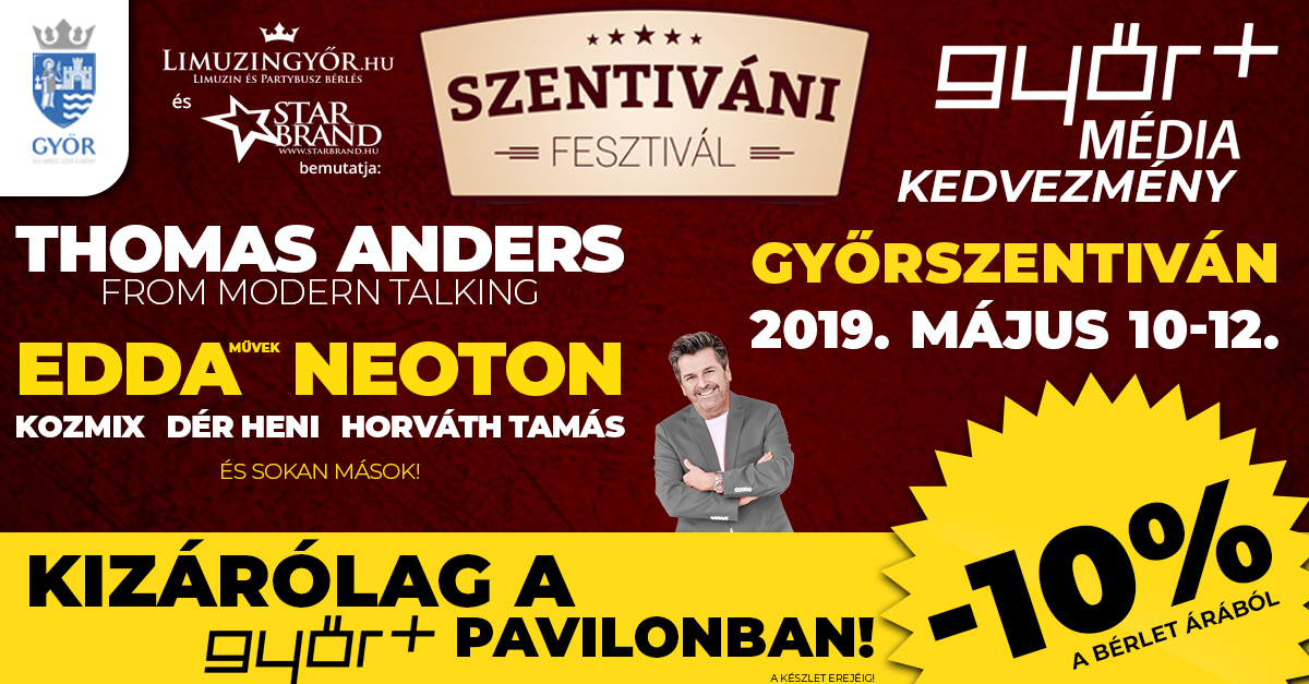 Győr legnagyobb tavaszi fesztiváljára jegye van Thomas Andersnek is, aki a Modern Talkinggal vált világszerte ismertté. Mármint repülőjegye, ő ad ugyanis élő koncertet május 11-én este. Aznap egy óriási retrobulira számíthatnak a kilátogatók: „a Modern Talking hangja” előtt a Neoton Família és DJ Dominique alapozzák meg a hangulatot, a német énekes után pedig a Kozmix és Náksi Attila lépnek színpadra.