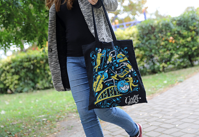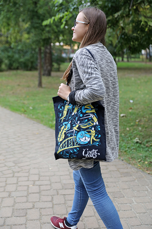 A mi táskánk is egy olyan darab lett, amelyet ringat az áramlat. A figurák arctalanok, éppen ezzel meghagyva a művész szabadságot a viselőjüknek. Bármelyik alakba beleképzelhetjük magunkat, lehetünk mi a trombitás, a táncos, vagy éppen az alkotó. Természetesen a kishajó sem maradhatott ki a motívumok közül, így összességében a végeredmény egy nagyon játékos, mozgalmas és trendi vászontáska lett, amely praktikus és akárhova visszük magunkkal azt hirdeti, hogy mennyire különleges a győri áramlás.