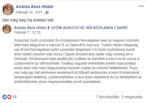 – Az ötletem, hogy felajánljam nekik a segítségem, abból ered, hogy tudom, milyen drága itt minden. Láttuk, hogy a Fradit kevesen kísérték el, vélhetően ez volt az egyik fő ok a távolmaradásra. Viszont kézilabdázóként tudom, mennyit számít, ha érzem, hogy minél többen szurkolnak a csapatnak és nekem. És a sok kicsi sokra megy, nem igaz? A Győr nagyobb táborral jön, és ha én hozzá tudok ehhez tenni, az jó érzés. Hely pedig van bőven. Segítünk nekik még a transzferben, szállást adunk, s reméljük, egy kis városnézés is belefér majd a programba. Amikor Facebookon közzétettem a felhívást, meg is kerestek a győri szurkolók, és több itt élő magyar szurkolóval együtt azon leszünk, hogy mindenben segíteni tudjuk a zöld-fehéreket. Már nagyon várjuk őket és a csapatot is!