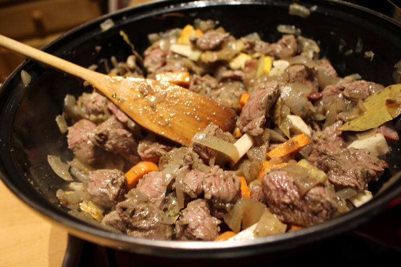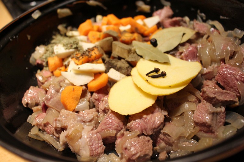 2- Keletkezik egy szép kis ágya a húskockáknak, amin azokat is megpirítjuk, majd jönnek a nagyon apróra vágott zöldségek és végül a fűszerek egyszerre, a só és a bor kivételével.