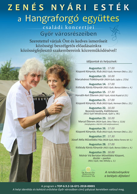 A Dr. Kovács Pál Könyvtár és Közösségi Tér augusztus 12-én új közösségi programsorozatot indít. A város legkülönbözőbb pontjain a Hangraforgó együttes Zenés nyári esték című családi koncertjén vehetnek részt az érdeklődők.