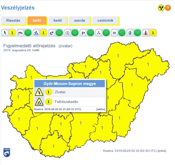 Elsődleges veszélyforrást a villámlás jelent, emellett esetenként szélerősödés, jégeső előfordulhat! Intenzív záporokból, zivatarokból rövid idő alatt 25-30 mm-t meghaladó csapadék hullhat.