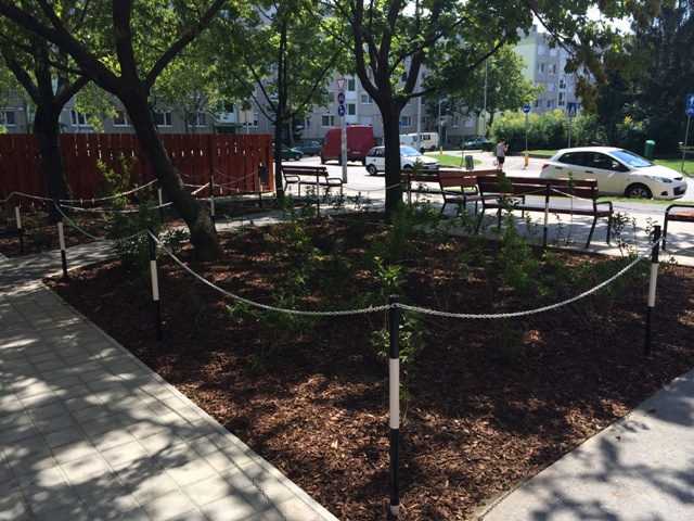 Radnóti Ákos a körzet önkormányzati képviselője elmondta, hogy először 2012. őszén az épületek előtti területeken került sor 120 cserjével a parkosításra, majd a területek lánccal való körbekerítésére, illetve a sarki részen pedig új, térkővel borított pihenőrész kialakítására. De nyolc új pad kihelyezése mellett új járdák is épültek a régiek felújítása mellett. 2013-ban további öt régi padot cseréltek, ill. öt újat is kiraktak szemeteskukákkal. Nemrég a pékség melletti sarki részen került sor a szelektív hulladéksziget, igényes, faborítású lekerítésére, újabb járda építésére a kitaposott, földes út helyett.