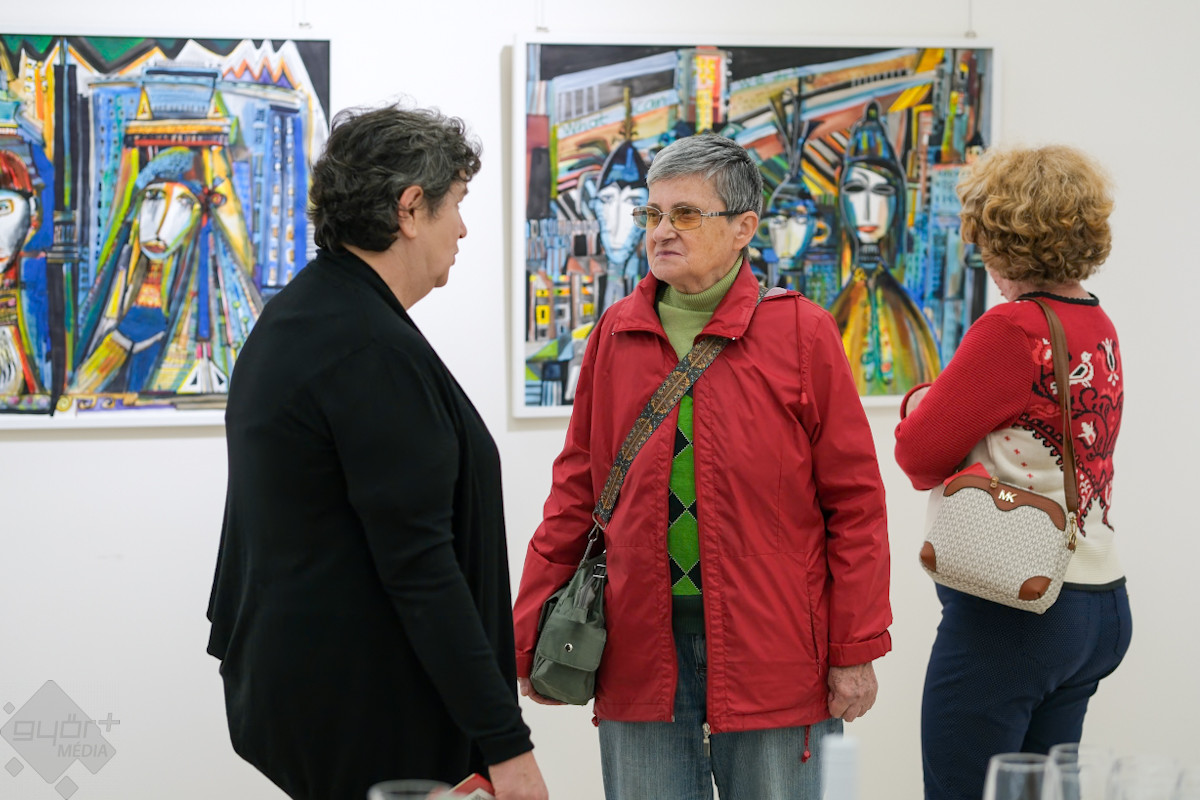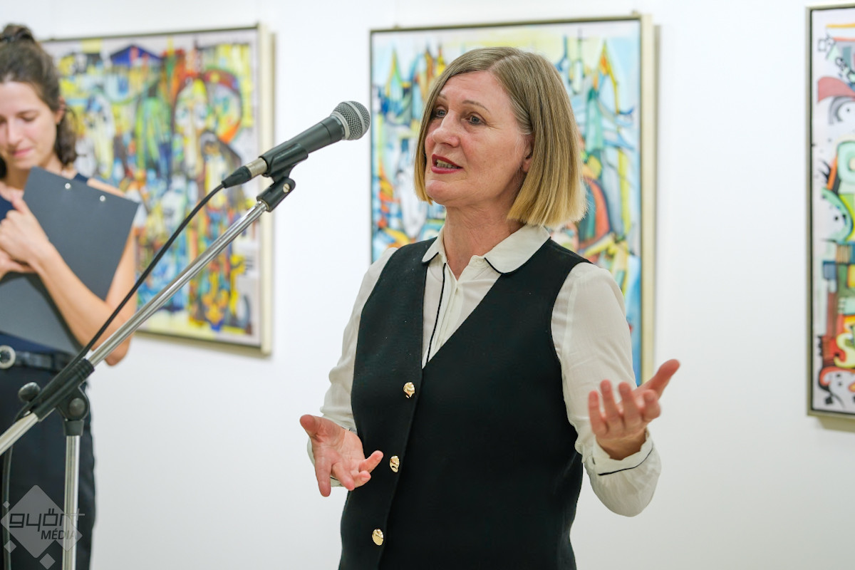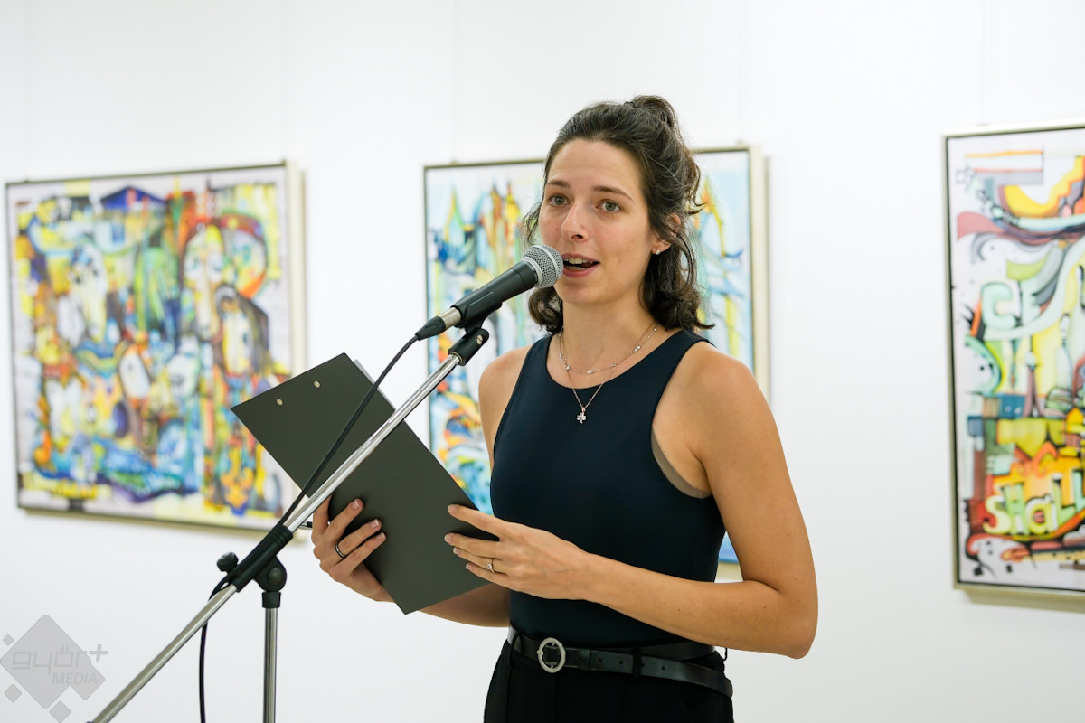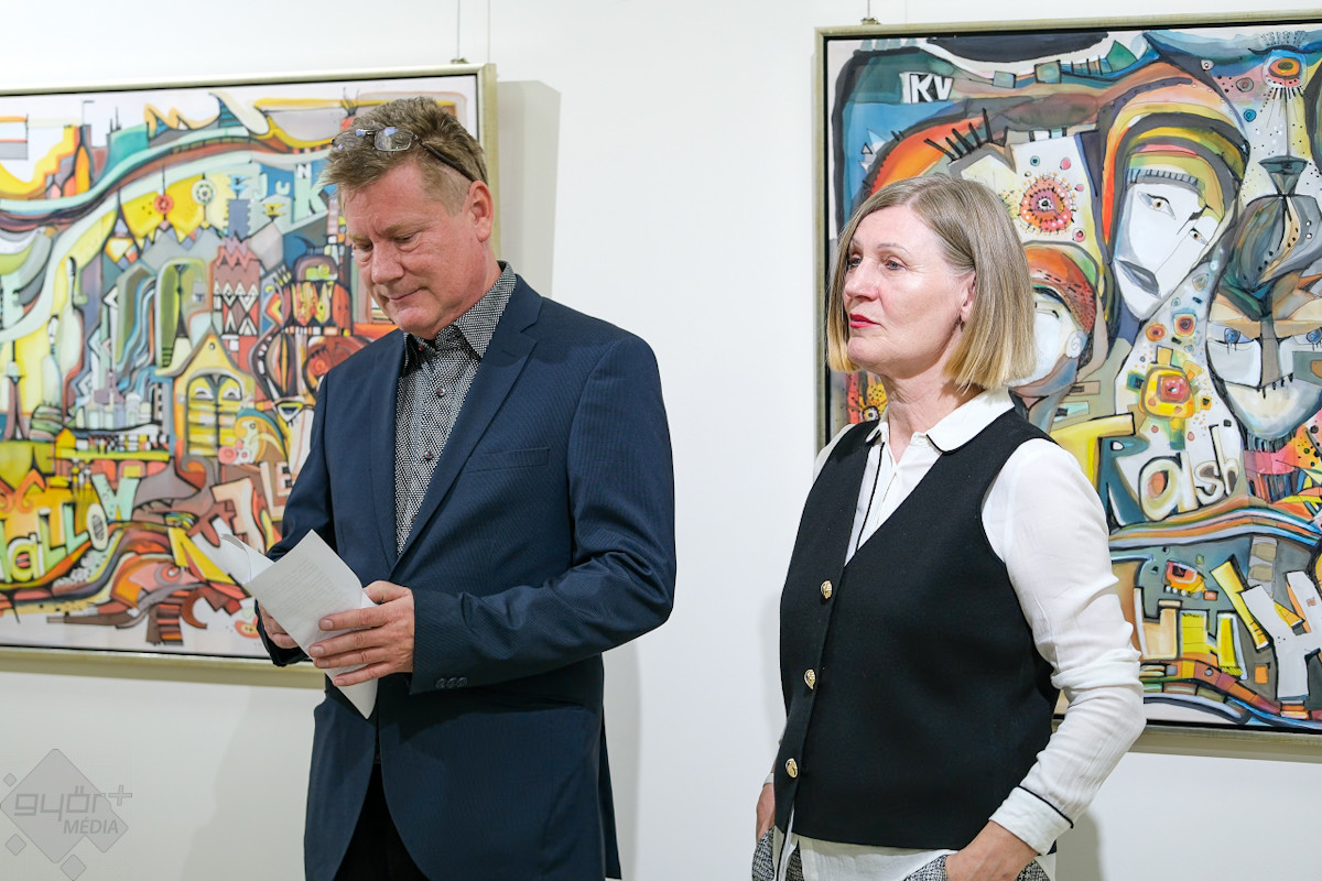A képek egyszerre komolyak és játékosak. Mintha egy városi mese elevenedne meg; groteszk és mégis mosolyt fakasztó világ, ahol a káosz és a rend folyton kacsintgat egymásra.” – hangsúlyozta beszédében.