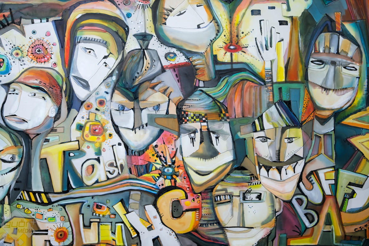 A művészet tükröt tart, nem elmenekít a káosztól, hanem megmutatja annak peremét. Az itt látható képek többnyire akrill és akvarell technikával készültek, a selyem mint egy fényáteresztő hordozófelület jelenik meg. Csurák Erzsébet urbánus univerzumot teremt, graffitiszerű nyomhagyások, groteszk maszkok, álomszerű történetfoszlányok, időtlen létezési formák sejlenek fel a felületein.