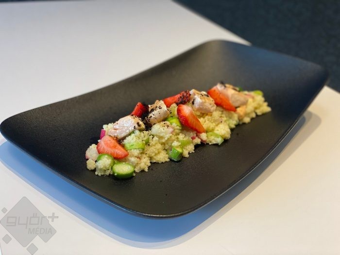 Spárgás kuszkusz grillezett lazacfalatokkal és eperrel