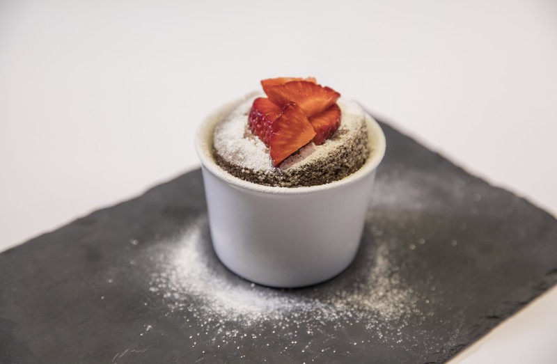 Kivajazott-cukrozott formákba töltjük körülbelül kétharmadig és előmelegített, 180 Celsius fokos sütőben nagyjából 10 percig sütjük. Friss eperrel tálaljuk.
