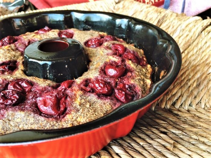 Egy tálba öntöm az egész masszát és jöhetnek az ínyencségek: fahéj, vaníliamag vagy pici aroma, 1 ek rum, esetleg mazsola. Az almákat hámozom és reszelem, majd a legvégén adom csak hozzá, alaposan elkeverem. Kivajazott, lisztezett formába öntöm bele és meggyel szórom, ha éppen kéznél van. Lehet bármilyen forma, attól függően, milyen szándékunk van a süteménnyel. Kuglófként, ha csupán csak a kávé mellé. Piteformába, hogy megálljon rajta a lekvár vagy tortaformába, ha egy jó kis vaníliakrémmel, pudinggal töltenénk és díszítenénk gyümölcsökkel.