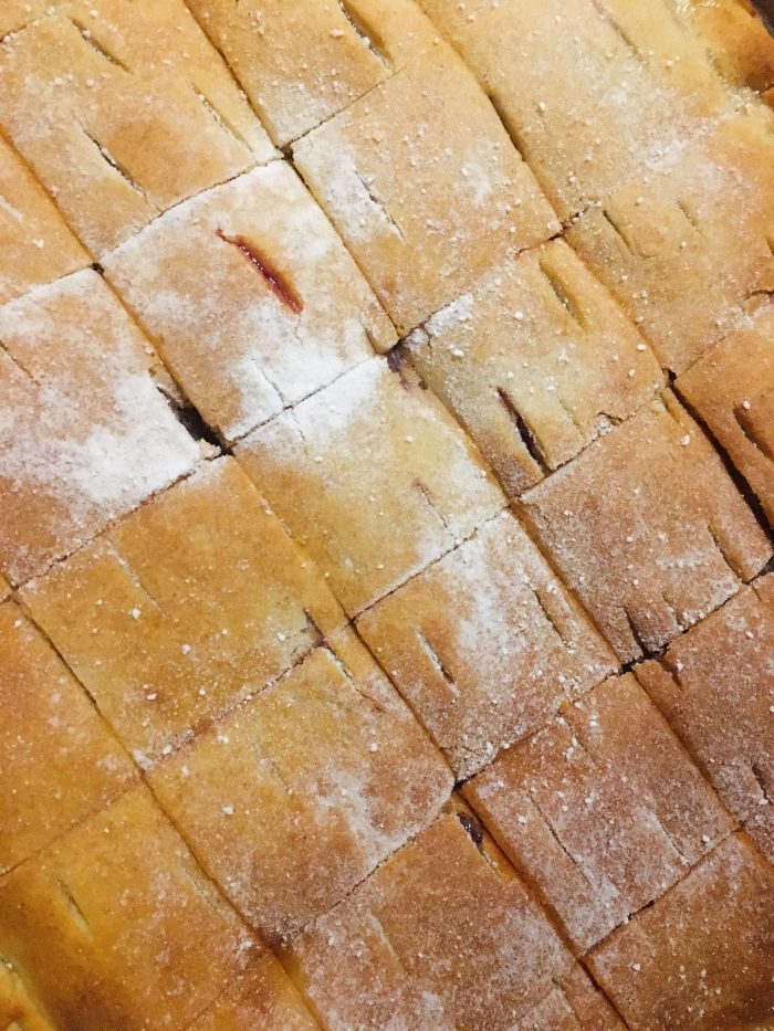 2. Az élesztőt bátran szórjuk bele és gyúrjuk együtt a többi hozzávalóval. A tésztát ezután 30 percig, lefóliázva a hűtőben pihentetem, majd kétfelé választom, és mindkét felét kinyújtom lisztezett felületen. Az egyiket a tepsi aljára, a másikat már a töltelék tetejére.