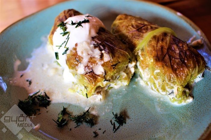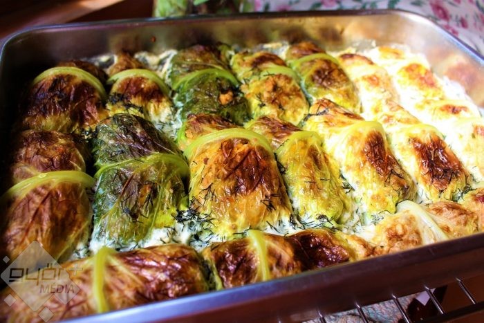 4. A kihűlt töltelékhez hozzákeverek egy tojást és beletöltöm a kellevelekbe. Szorosan feltekerem és azonnal a kiolajozott tepsibe sorakoztatom őket. Összekeverem a tejszínt, a tejet, aprított kaprot és egy citrom levét, majd ráöntöm. Előmelegített sütőben 190 fokon 35 percig sütöm.