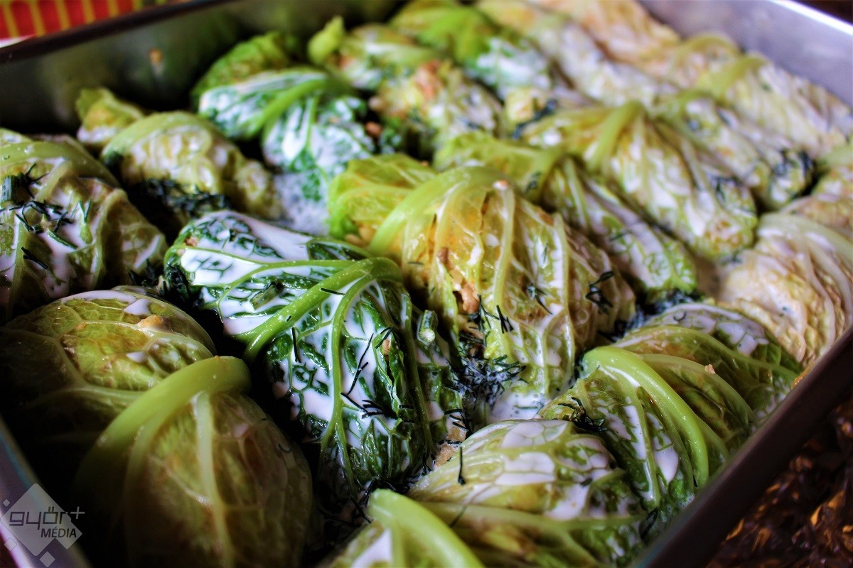 4. A kihűlt töltelékhez hozzákeverek egy tojást és beletöltöm a kellevelekbe. Szorosan feltekerem és azonnal a kiolajozott tepsibe sorakoztatom őket. Összekeverem a tejszínt, a tejet, aprított kaprot és egy citrom levét, majd ráöntöm. Előmelegített sütőben 190 fokon 35 percig sütöm.