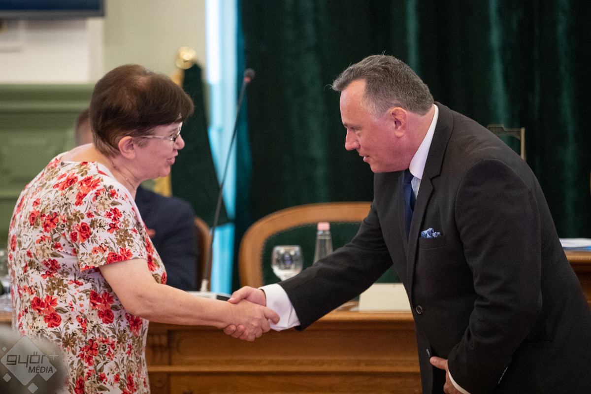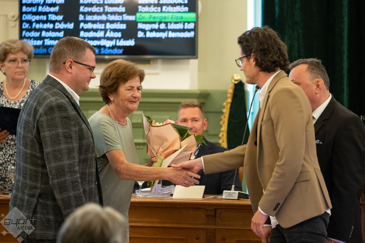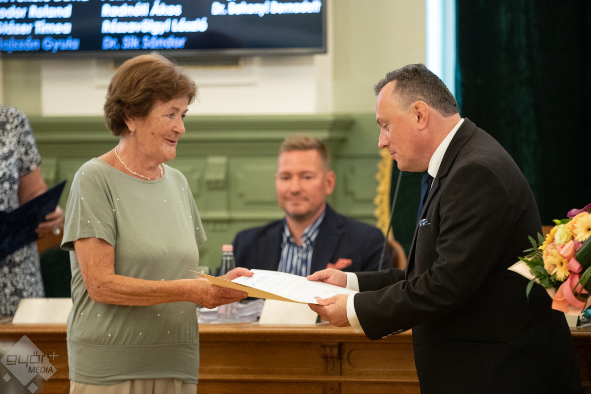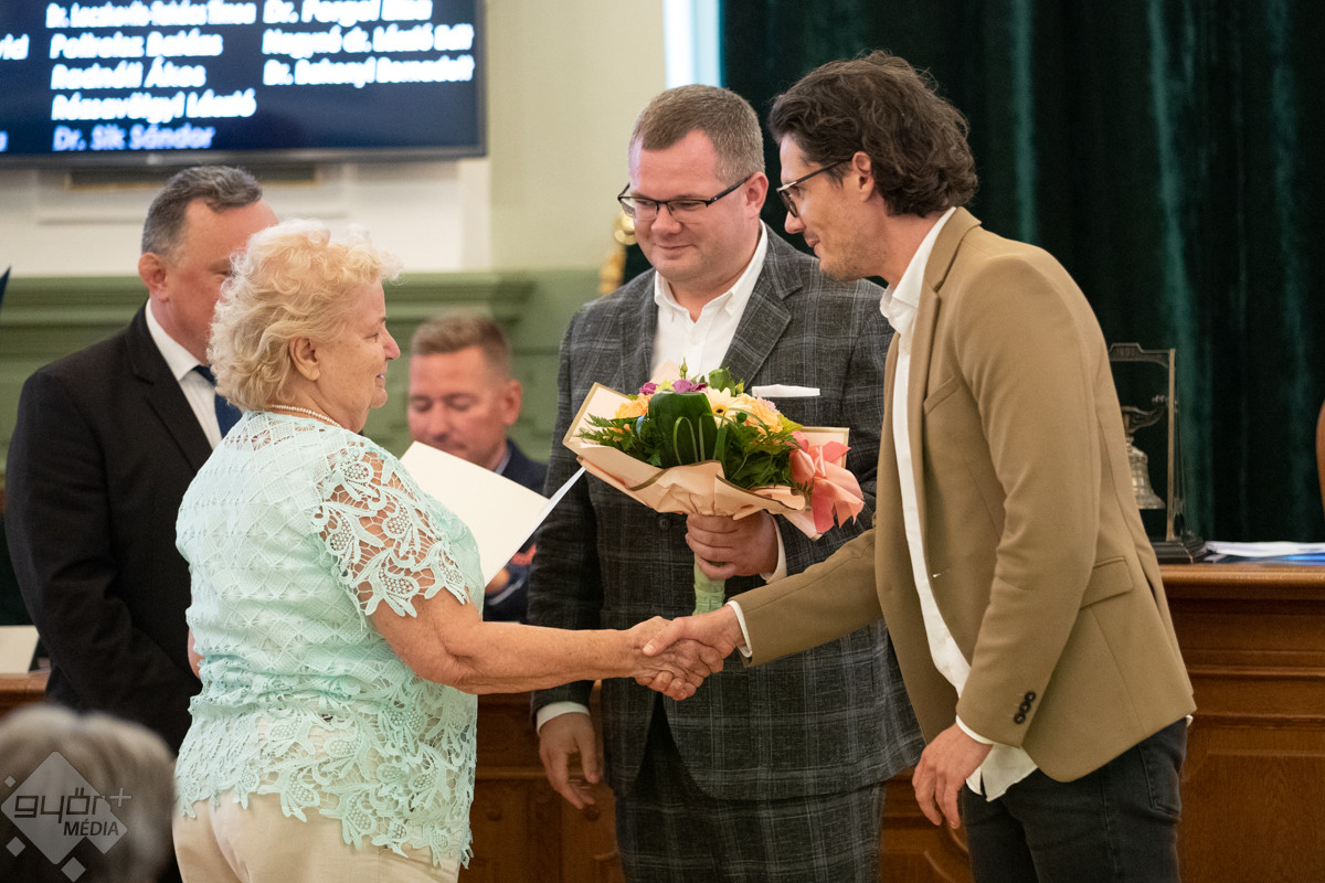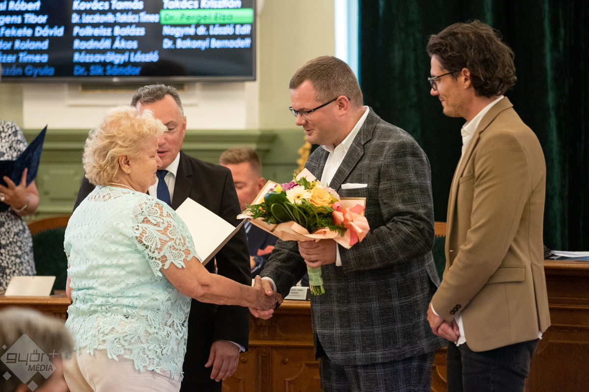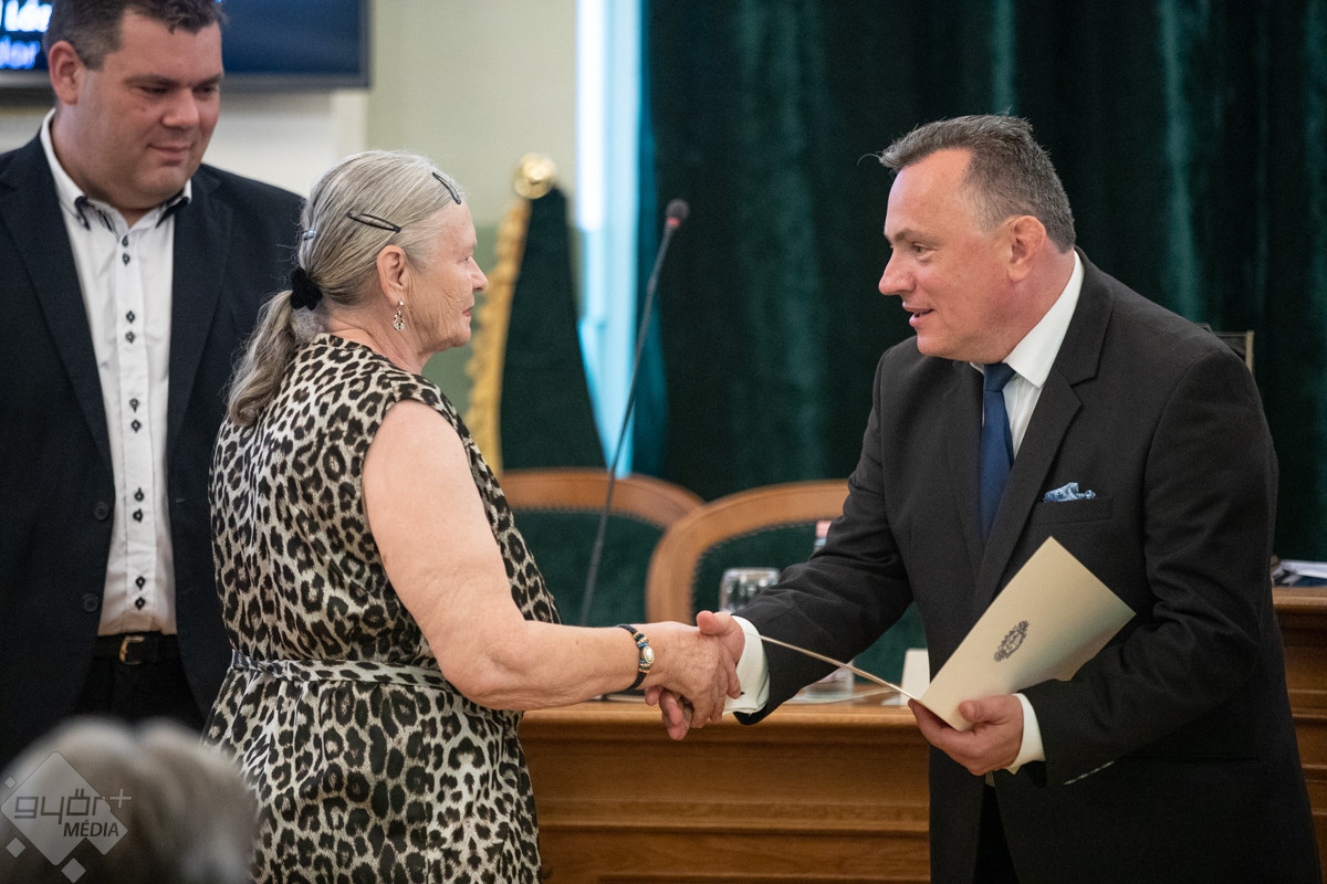 Városrészekért díjakkal jutalmaztak többeket a napirendi pontok előtt. Adyváros szolgálatáért-díjat kapott Márkus Kálmánné a lakókörnyezete tisztasága, szépítése érdekében végzett munkája és közösségi tevékenysége elismeréseként. Bácsa Szálgálatáért-díjat kapott dr. Bérces Lászlóné háziorvos háziorvosi tevékenysége elismeréseként, valamint Zsédely Máté a polgárőri munkája elismeréseként. Belváros Szolgálatáért-díjat kapott Forgács Barnabásné a közösség érdekében végzett tevékenysége, valamint pénzügyi munkássága elismeréseként. Szintén Belváros Szolgálatáért díjat kapott Makk Tamásné a Belváros társadalmi kapcsolatainak építésében vállalt aktív munkájáért, és Pálfi Károlyné a Belváros társadalmi kapcsolatainak építésében vállalt aktív munkájáért. Marcalváros szolgálatáért-díjat kapott Kiss Zoltán és Koller János, Ménfőcsanak szolgálatáért-díjat kapott Kulcsár Béla,