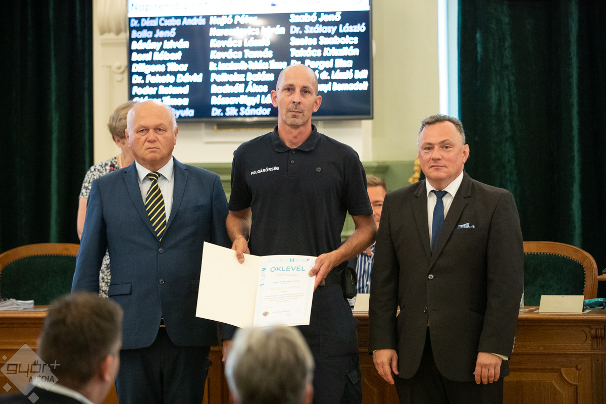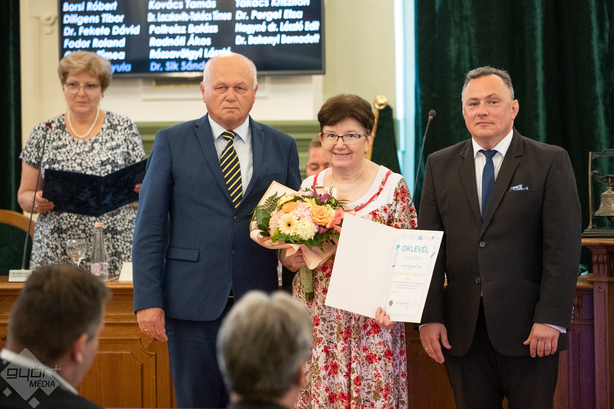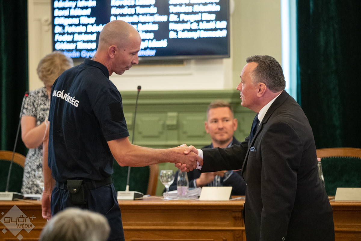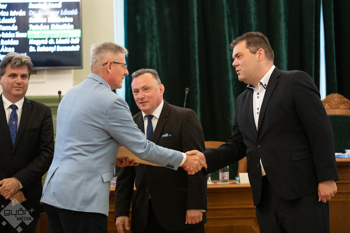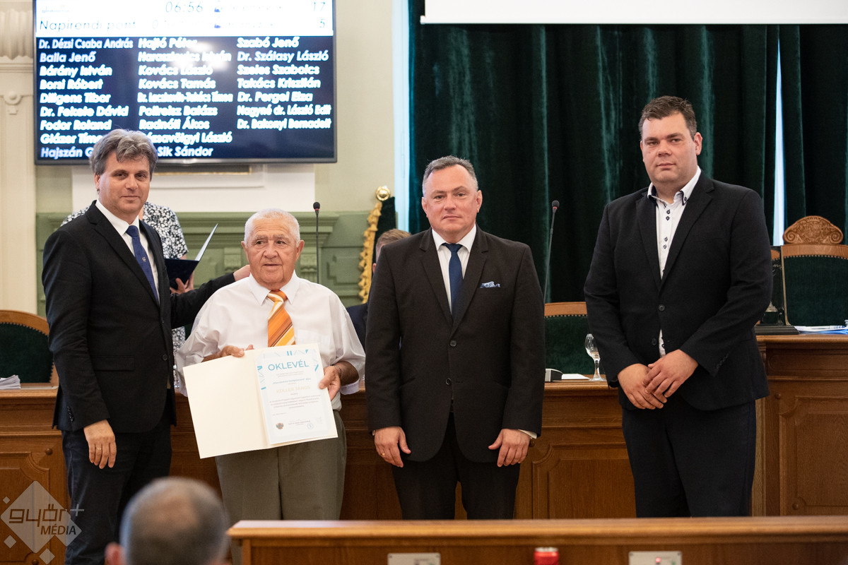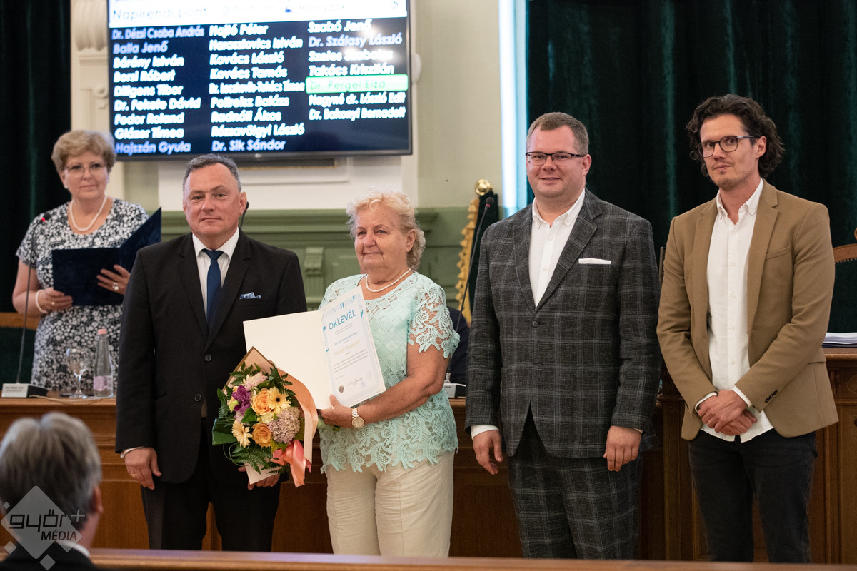 Városrészekért díjakkal jutalmaztak többeket a napirendi pontok előtt. Adyváros szolgálatáért-díjat kapott Márkus Kálmánné a lakókörnyezete tisztasága, szépítése érdekében végzett munkája és közösségi tevékenysége elismeréseként. Bácsa Szálgálatáért-díjat kapott dr. Bérces Lászlóné háziorvos háziorvosi tevékenysége elismeréseként, valamint Zsédely Máté a polgárőri munkája elismeréseként. Belváros Szolgálatáért-díjat kapott Forgács Barnabásné a közösség érdekében végzett tevékenysége, valamint pénzügyi munkássága elismeréseként. Szintén Belváros Szolgálatáért díjat kapott Makk Tamásné a Belváros társadalmi kapcsolatainak építésében vállalt aktív munkájáért, és Pálfi Károlyné a Belváros társadalmi kapcsolatainak építésében vállalt aktív munkájáért. Marcalváros szolgálatáért-díjat kapott Kiss Zoltán és Koller János, Ménfőcsanak szolgálatáért-díjat kapott Kulcsár Béla,