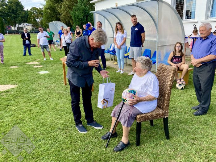 A 103 éves Nagy Ferencné Erzsi néni végezte el a kezdőrúgást az idén 100 éves Győrszentiván SE szombati bajnoki mérkőzésén.