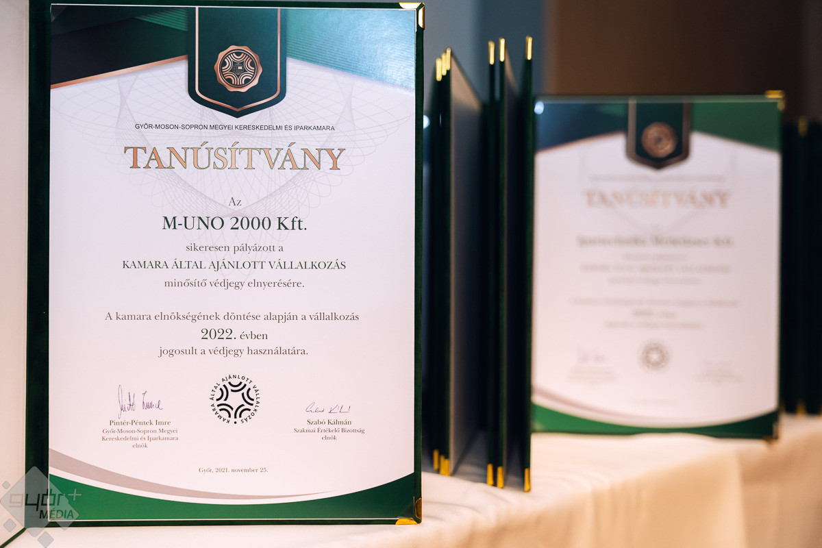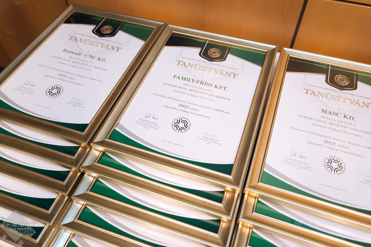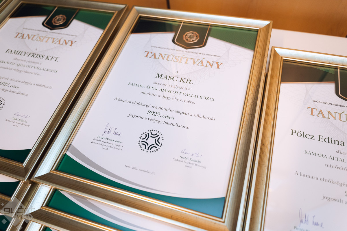 A Győr-Moson-Sopron Megyei Kereskedelmi és Iparkamarában átadták Kamarai Védjegyeket, azoknak a vállalkozásoknak, amelyek megfeleltek a megbízhatósági követelményeknek. Ebben az évben 104 vállalkozás szerezte meg a jogosultságot, hogy használhassa az egy évig érvényes tanúsítványt.