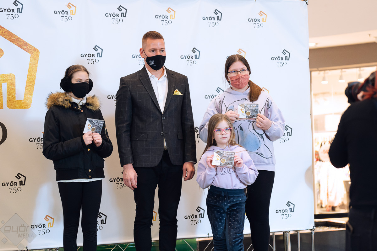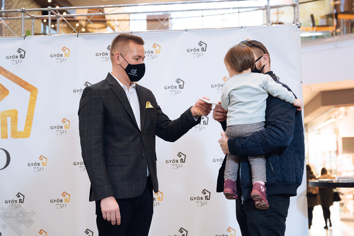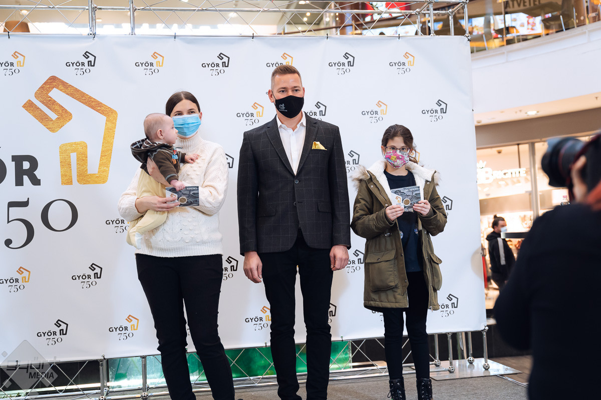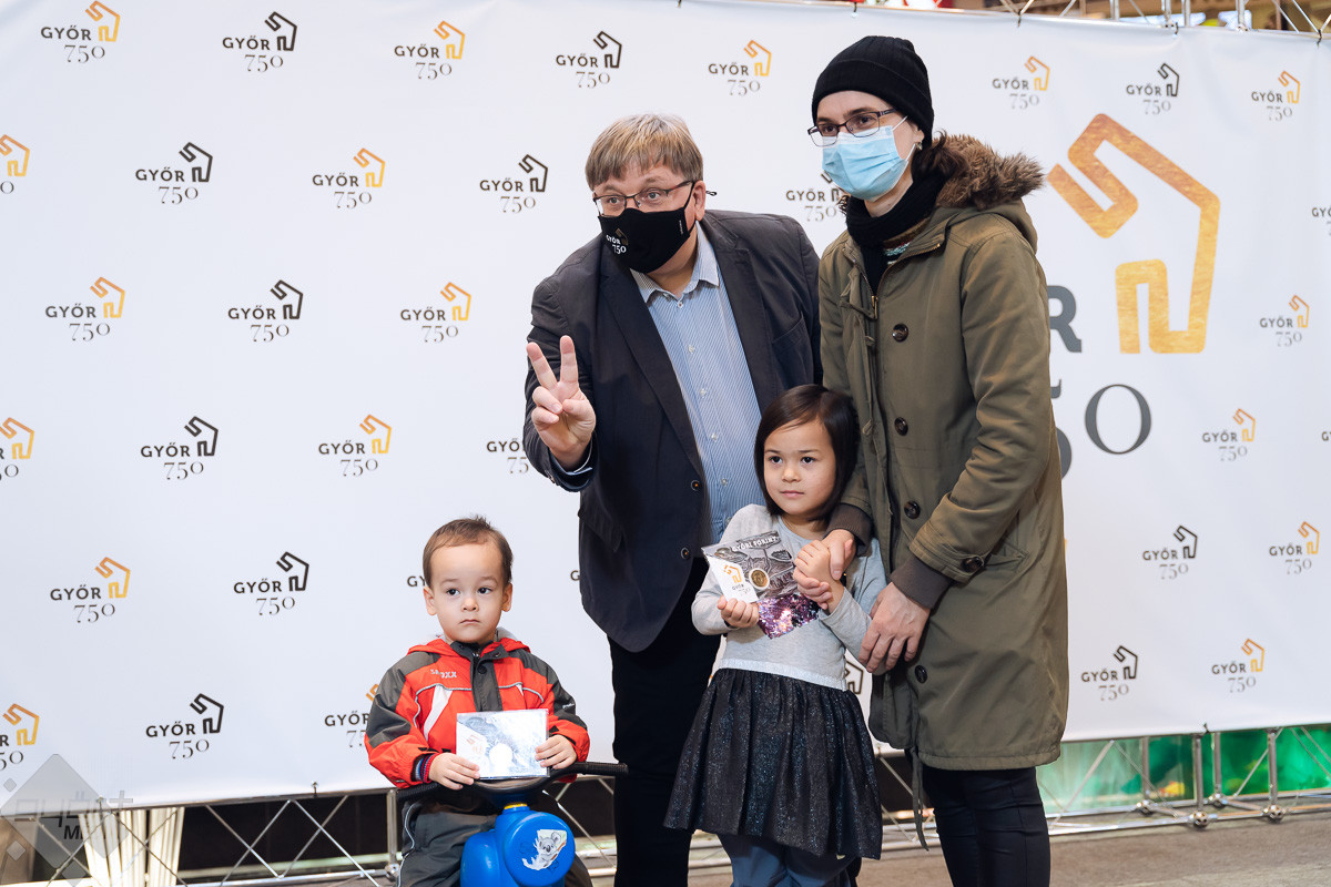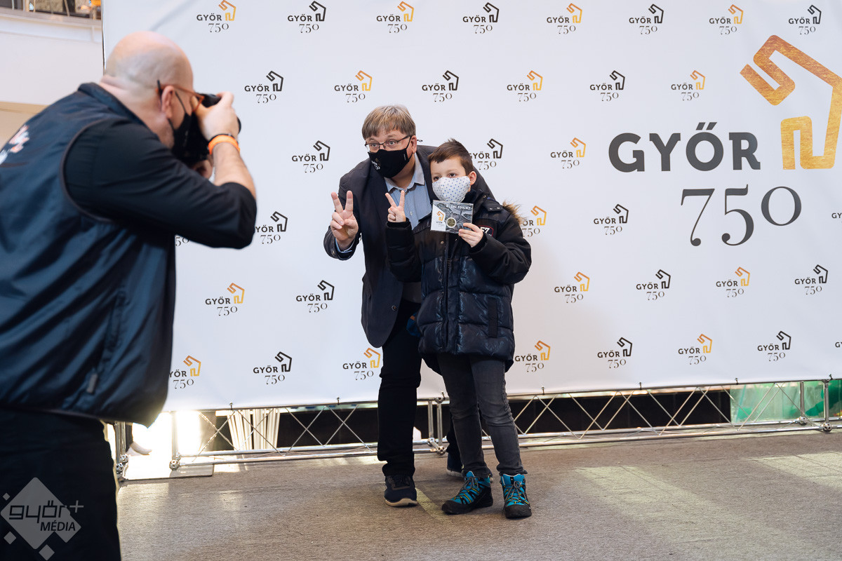 A mostani új környezet az Árkád Győr szökőkútjai mellett található. Itt egy két oldalról megközelíthető, profi színpadot állítottak fel. Ide várják a kicsiket és a nagyokat is, akikből akadt bőven, ezúttal több egy év alatti csöppség is átvette az ajándékot. Csütörtök délután ismét Dr. Dézsi Csaba András, a város első embere várta az érmére jogosultakat, társa pedig ezúttal Radnóti Ákos, alpolgármester volt.