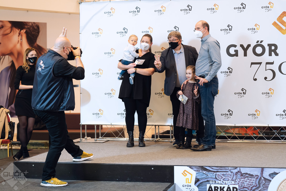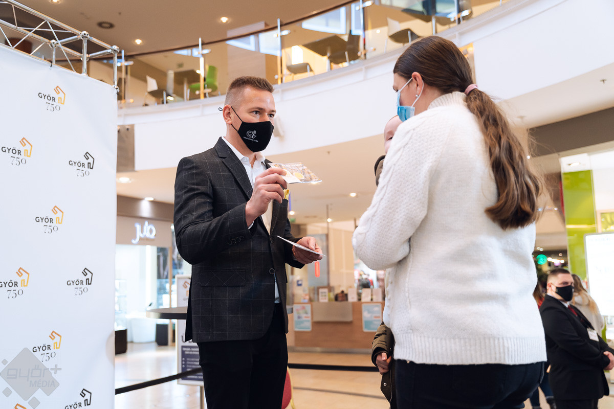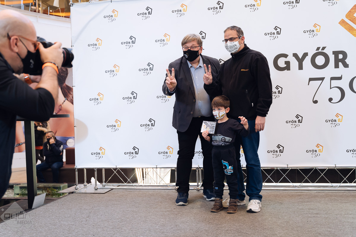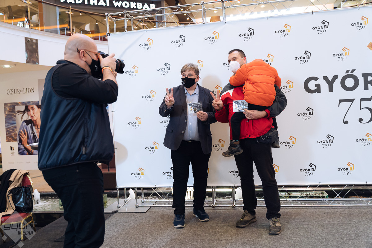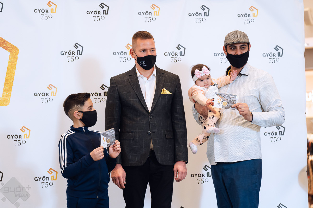 A mostani új környezet az Árkád Győr szökőkútjai mellett található. Itt egy két oldalról megközelíthető, profi színpadot állítottak fel. Ide várják a kicsiket és a nagyokat is, akikből akadt bőven, ezúttal több egy év alatti csöppség is átvette az ajándékot. Csütörtök délután ismét Dr. Dézsi Csaba András, a város első embere várta az érmére jogosultakat, társa pedig ezúttal Radnóti Ákos, alpolgármester volt.