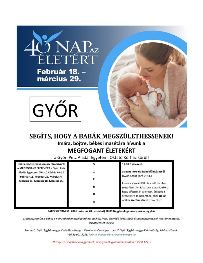 2026. március 28-án 18.00-kor a győri Nagyboldogasszony-székesegyházban szentmisével zárják a tavaszi 40 nap az Életért békés imaalkalmat.