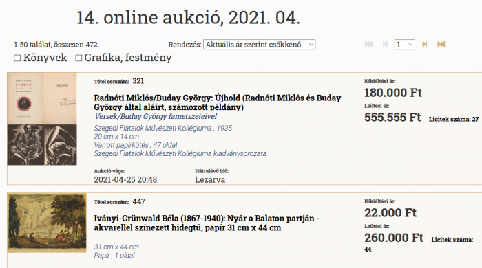 Az antikvárium.hu vasárnap este zárult aukcióján a költő Buday György által illusztrált, aláírt, számozott verseskötetért licitáltak a gyűjtők. A Szegedi Fiatalok Művészeti Kiadványok sorozatban megjelent könyv első kiadásának egy darabja került kalapács alá. Újhold címmel 1935-ben jelent meg.