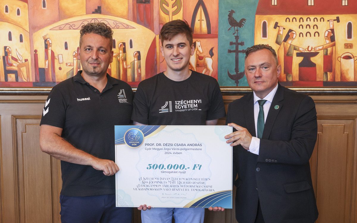 „Sok szempontból üzenetértéke van ennek a támogatásnak. A város próbál minden újszerű kezdeményezést felkarolni, most egy olyan világhírű játék kapcsán, melynek győri képviselői viszik a város jó hírét. Az egyetemmel való együttműködésünknek számos formája van, de azért is erős a városunk mert a különböző intézmények összefogva, közösen dolgoznak a sikerekért. Reméljük, hogy trófeával érkeznek haza a játékosok” – biztatta a versenyzőket Szeles Szabolcs, majd az alpolgármester a támogatást jelképező emléktáblát is átnyújtotta a Bisinger-teremben rendezett csütörtöki találkozón.