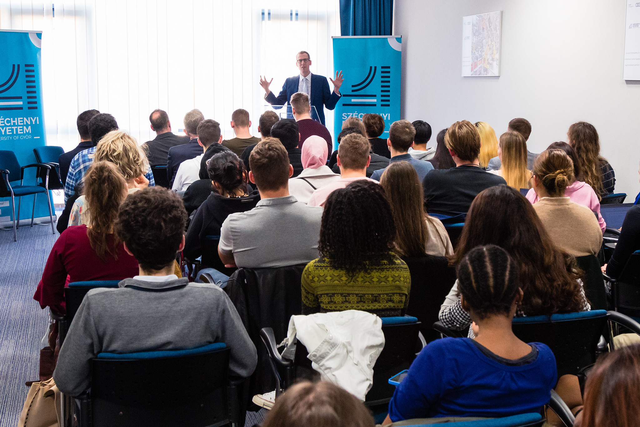 Csordultig megtelt érdeklődő hallgatókkal a Széchenyi István Egyetem Menedzsment Campus épületének egyik terme, ahol Andrew Davidson brit nagykövet-helyettes tartott angol nyelvű előadást a napokban.