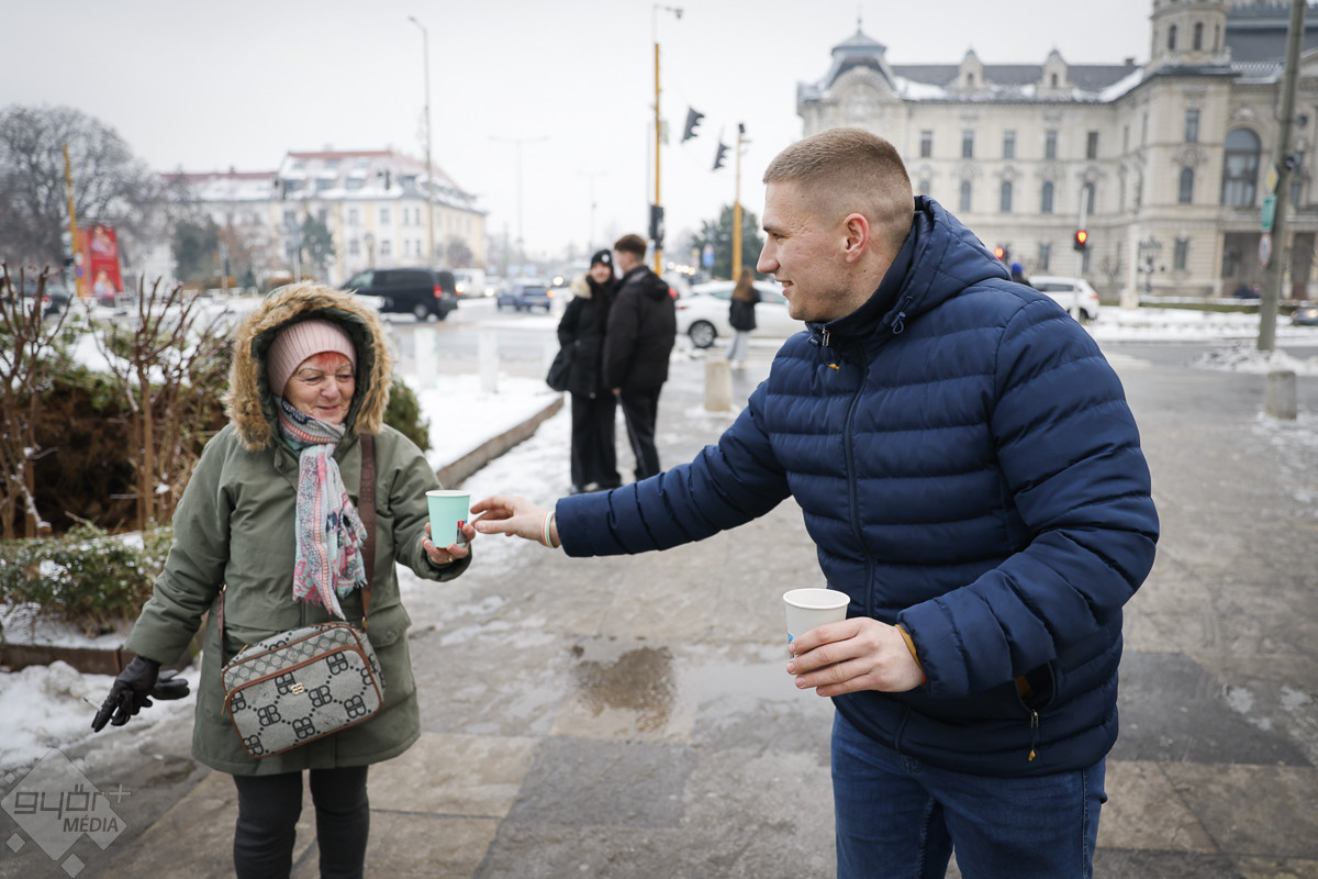 Hideg, esős idő volt Győrben január 13-án is, ilyenkor pedig különösen jól esik egy pohár forró tea. A Vármegyeháza előtti téren Shah Amir, a Fidelitas Győr-Moson-Sopron vármegyei elnöke és barátai kínálták meleg itallal a járókelőket.