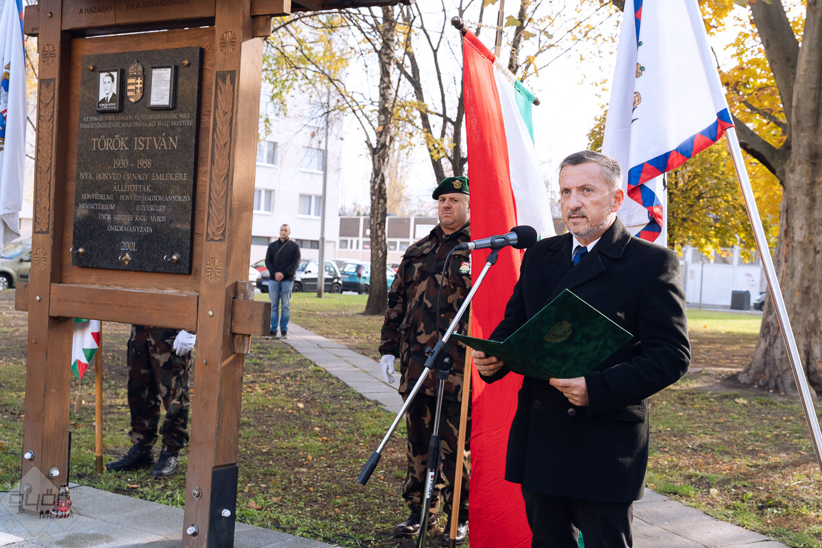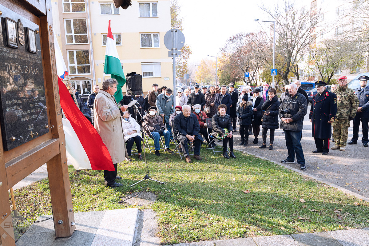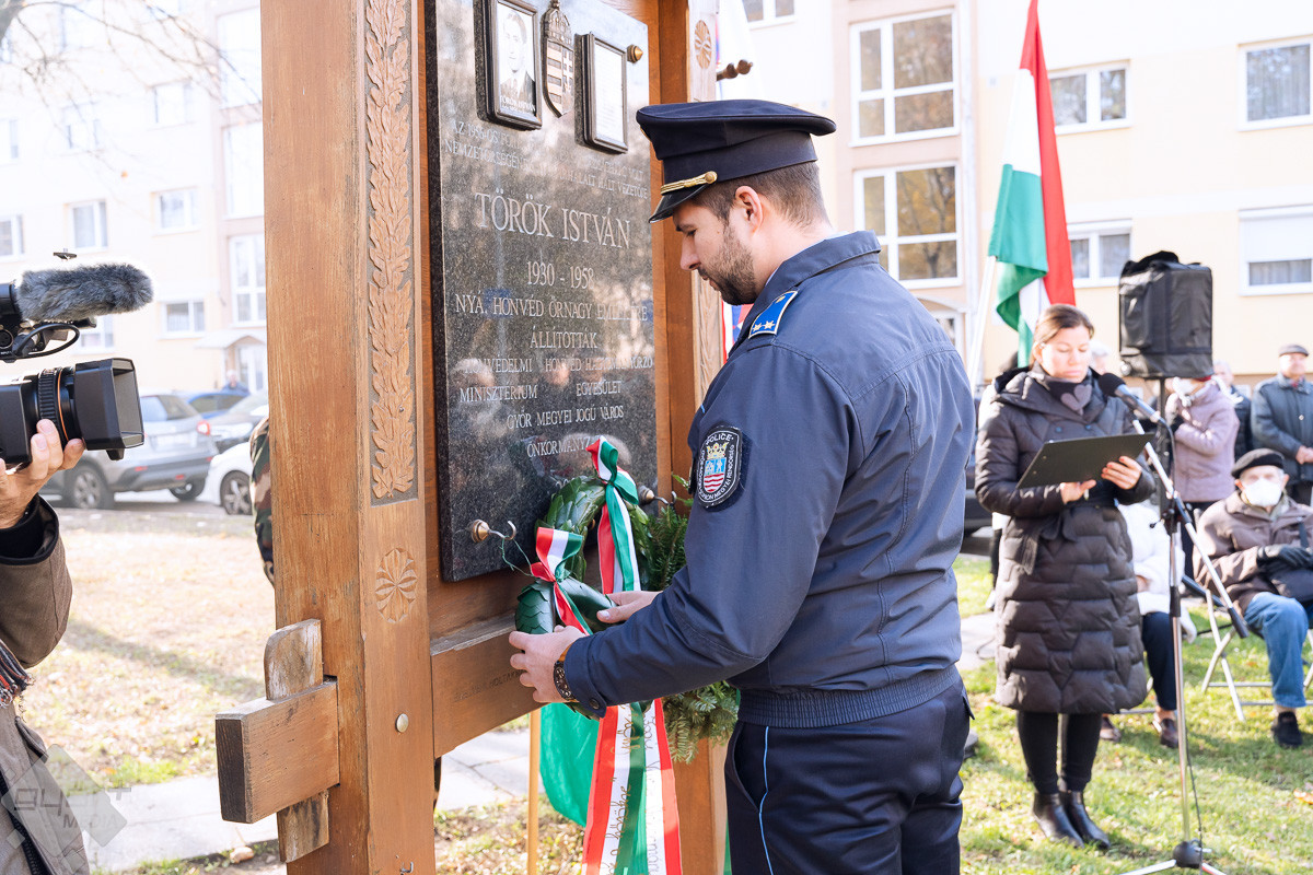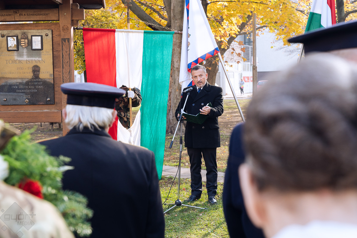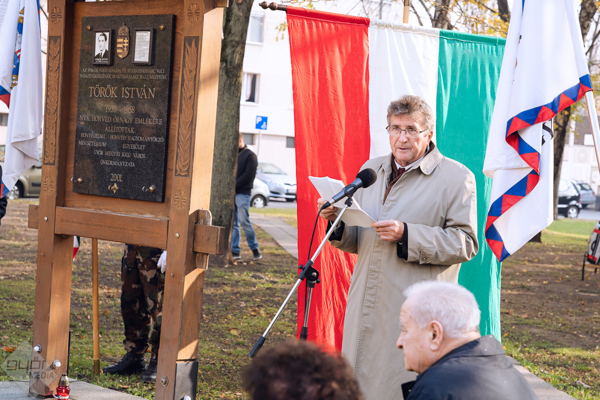 „A világon páratlan szabadságharc volt ez, a fiatal nemzedékkel a népünk élén. Azért folyt, mert a nemzet szabadon akart dönteni arról, hogy miképpen éljen.” Mindszenthy József bíboros szavaival kezdte ünnepi beszédét dr. Szálasy László önkormányzati képviselő, majd életrajzi részletekkel idézte fel Török István alakját. Segítőkész, másokért tenni sosem rest fiatal volt. Katonai pályára készült, de vallásos neveltetése és az elnyomás elleni lázadása miatt a tüzértiszti iskolában az alhadnagyi rangfokozat megszerzése után leszerelték. 1956 tavaszán költözött Győrbe, a vagongyárban dolgozott vasesztergályosként. Közös albérletben lakott Büki Lajossal, akivel barátságot kötöttek, s később együtt vettek részt a forradalomban is.