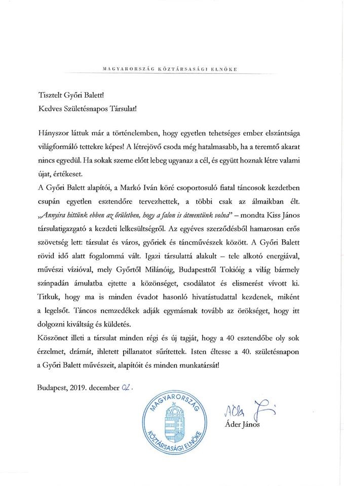 Áder János köztársasági elnök a 40 éves Győri Balettet levélben köszöntötte, ezt adjuk most közre.