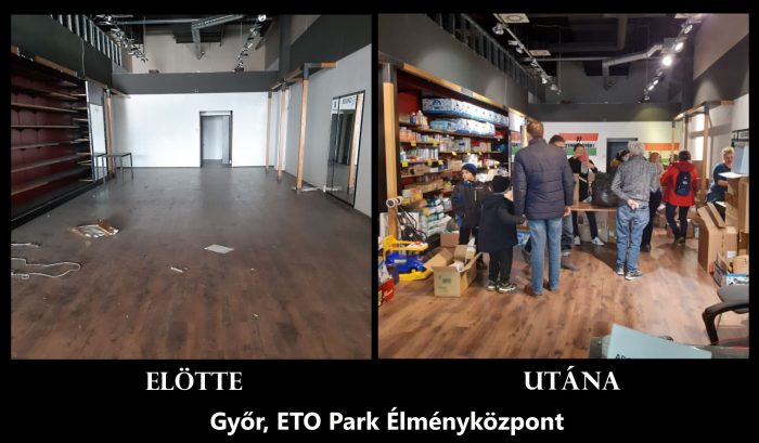 Az önkéntesek néhány napja nagy segítséget kaptak, hiszen az ETO Park Élményközpont területén található egyik üzlethelyiséget használhatják központként. Ebben segítségükre volt Granát Gábor az ETO FC marketingvezetője, az egész labdarúgó klub és az ETO Parkot üzemeltető WHB Facility Management részéről Simon Csaba is. Az élményközpont bejárása után a választás az egykori Süti Depó helyére esett, ahol megfelelő körülmények között fogadhatják, szortírozhatják, tárolhatják és csomagolhatják az adományokat.
