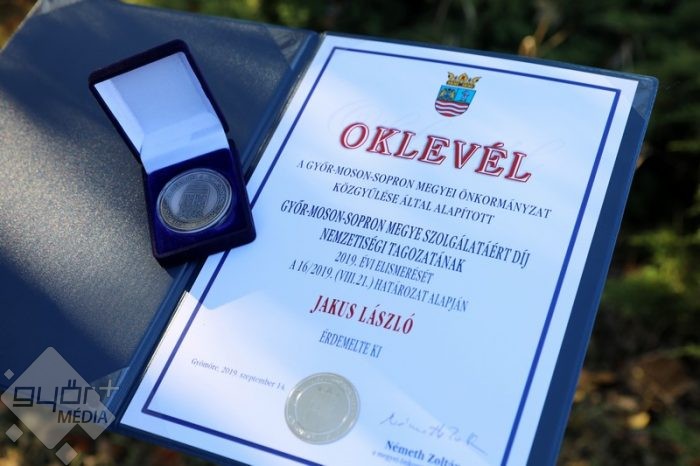 Jakus Lászlónak szeptemberben, az egyesület gyömörei önkormányzattal közös rendezvényén, a III. Toronyiránt Vásári Forgatagon, Németh Zoltán, a Győr-Moson-Sopron Megyei Önkormányzat elnöke adta át a Győr-Moson-Sopron Megye Szolgálatáért Díj Nemzetiségi Tagozata kitüntetést. „Nagyon köszönöm elnök úrnak és a Nemzetiségi Bizottságnak is, hogy rám gondoltak. Felemelő érzés, ami nagy felelősséggel is jár” – mondja az egyesület elnöke, majd hozzáteszi: „a kollégáimnak és a partnereimnek is ajánlom ezt a díjat, nélkülük nem sikerülne valóra váltani az elképzeléseinket. Most, néhány hét elteltével kezdem érezni, hogy mekkora erőt és lendületet ad ez az elismerés.”