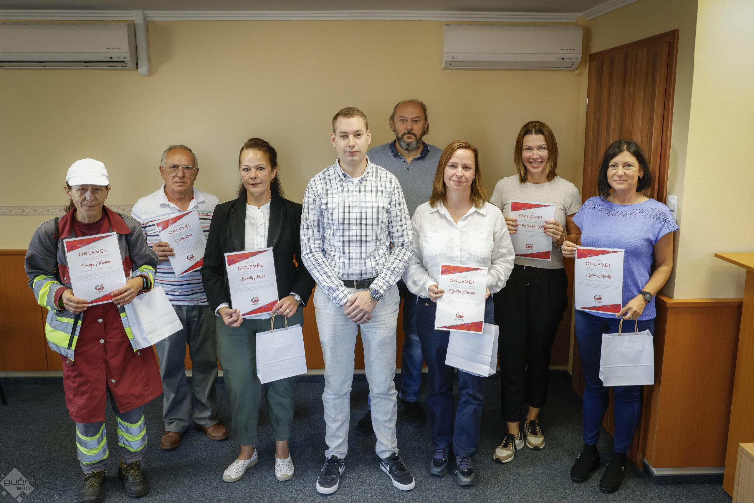 Az oklevelet és a vele járó ajándékot ezúttal Pozsgai Ferencné kézi parkgondozó, Csonka István csőszerelő, Horváth Andrea piacfelügyelő, Bella István művezető, Bertha Julianna ügyintéző, Horváth-Szőnyi Dorottya marketing- és kommunikációs koordinátor és Szabó Hajnalka ügyintéző kapta. Az elismeréseket Nagy Dávid (a képen elöl, középen), a Győr-Szol Zrt. vagyonkezelési igazgatója adta át.
