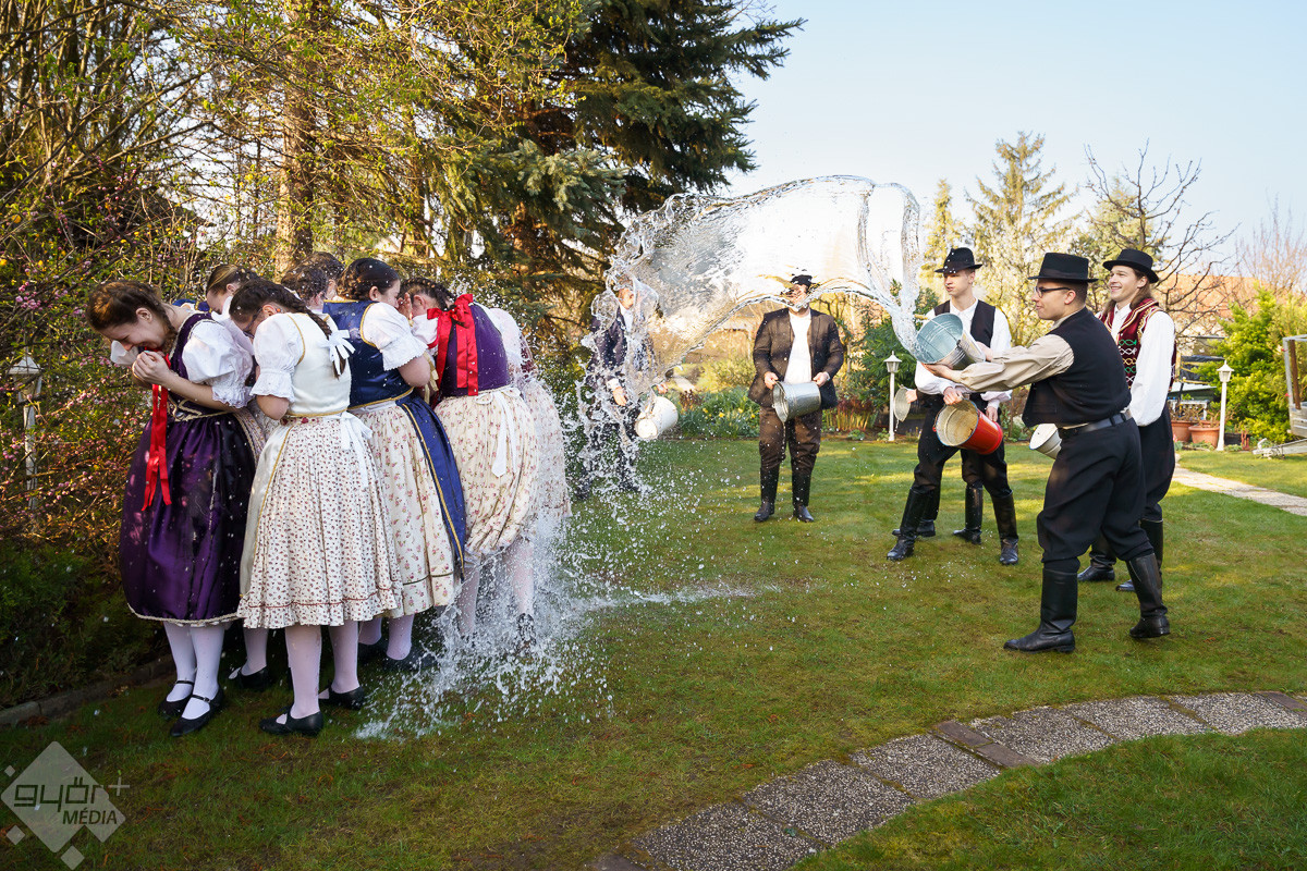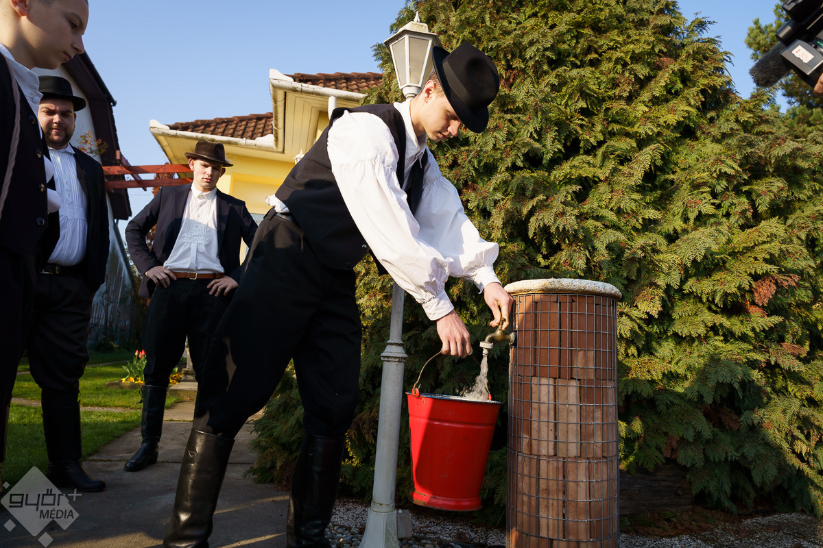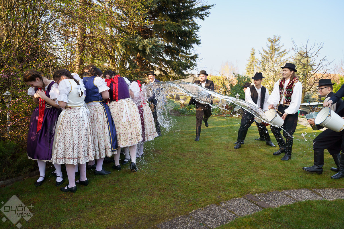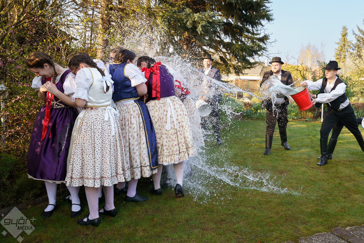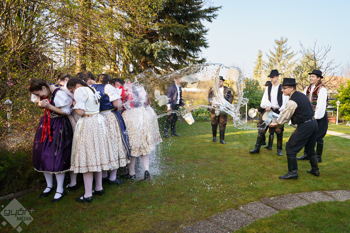 Korán reggel népviseletben várták a ménfőcsanaki Marcal Tánc -és Népművészeti Egyesület lányai a fiúkat. A legények is megfelelő öltözetben, öblös vödrökkel érkeztek, amiket kútvízzel töltöttek meg. A lányokat kiküldték az udvarra, majd a különleges locsolóvers után jó nagy adag vizet kaptak a nyakukba, így már biztosan nem hervadnak el.