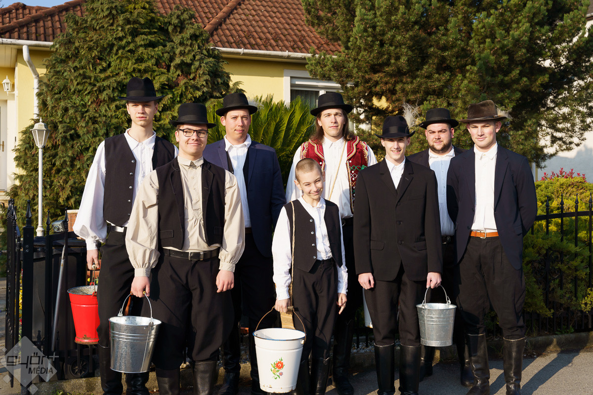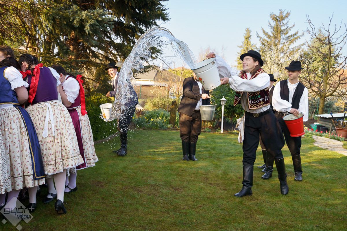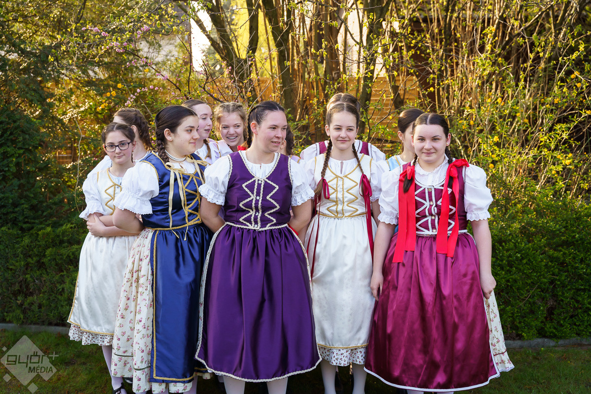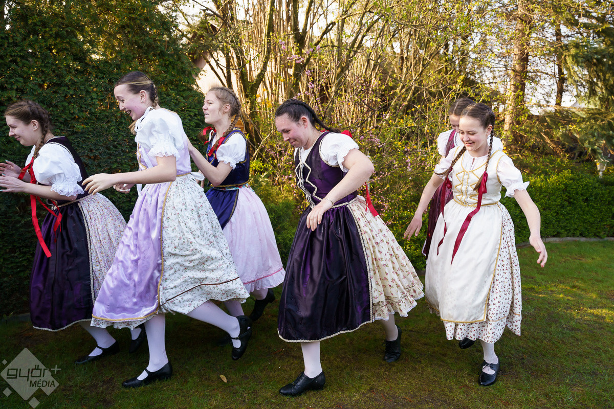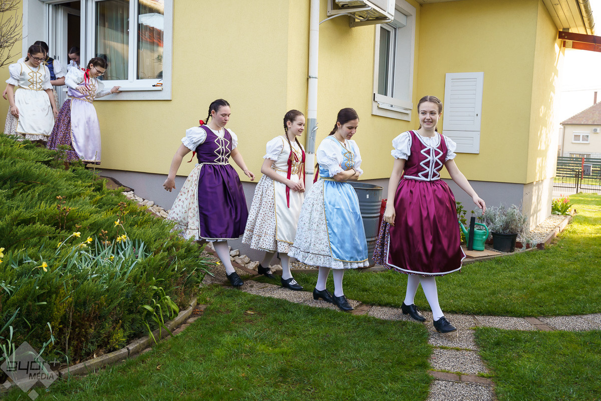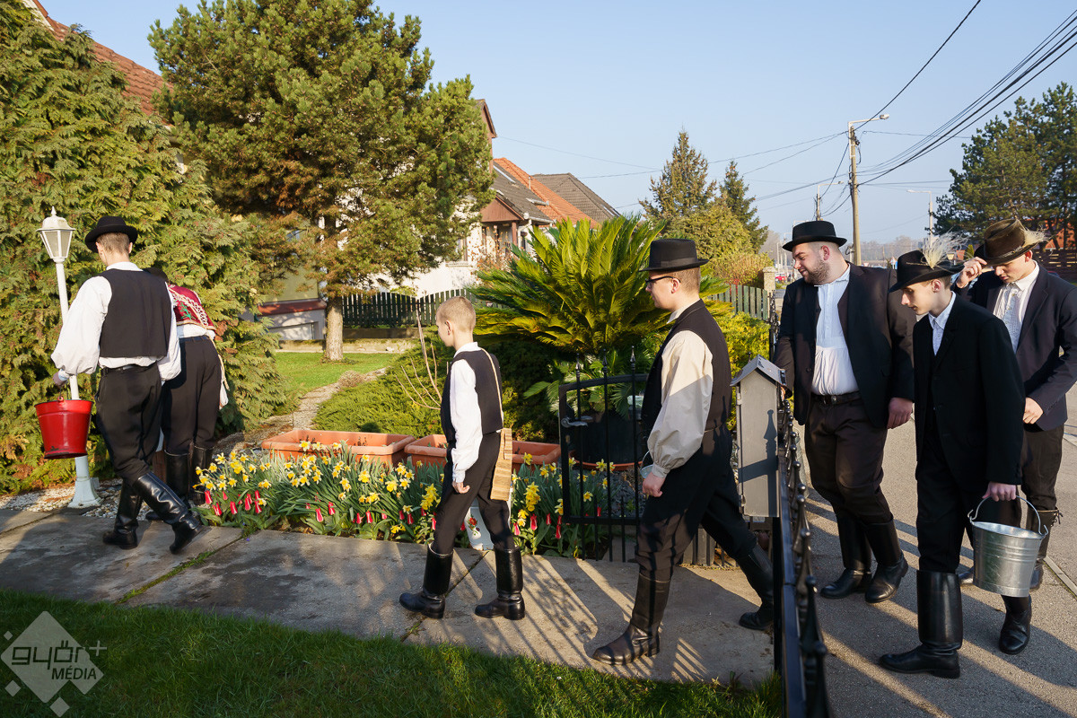 Korán reggel népviseletben várták a ménfőcsanaki Marcal Tánc -és Népművészeti Egyesület lányai a fiúkat. A legények is megfelelő öltözetben, öblös vödrökkel érkeztek, amiket kútvízzel töltöttek meg. A lányokat kiküldték az udvarra, majd a különleges locsolóvers után jó nagy adag vizet kaptak a nyakukba, így már biztosan nem hervadnak el.