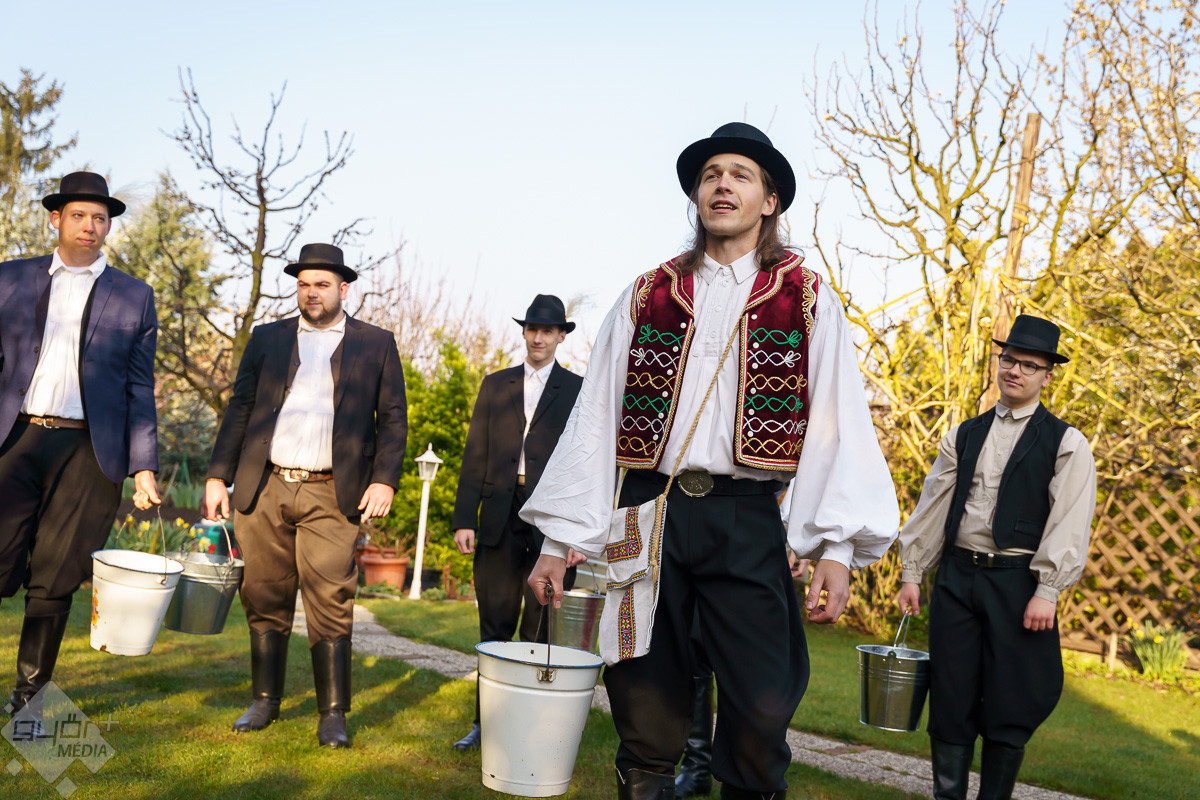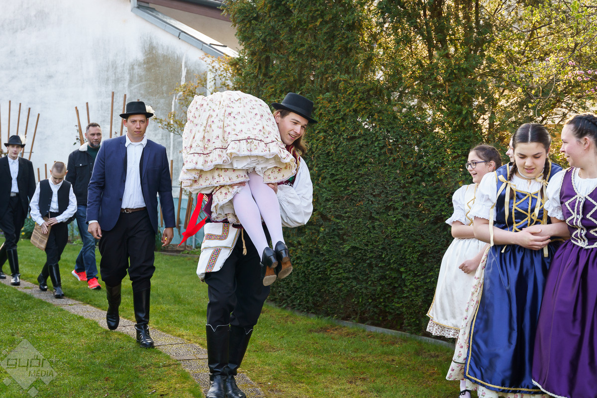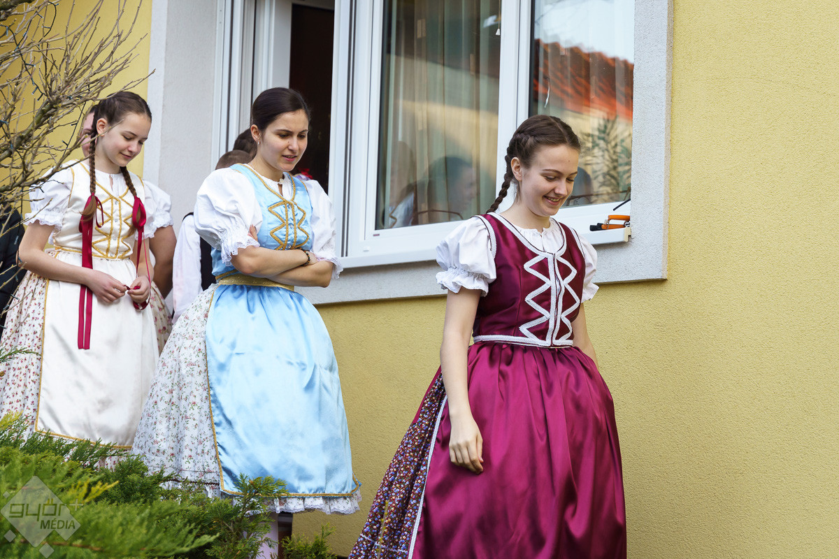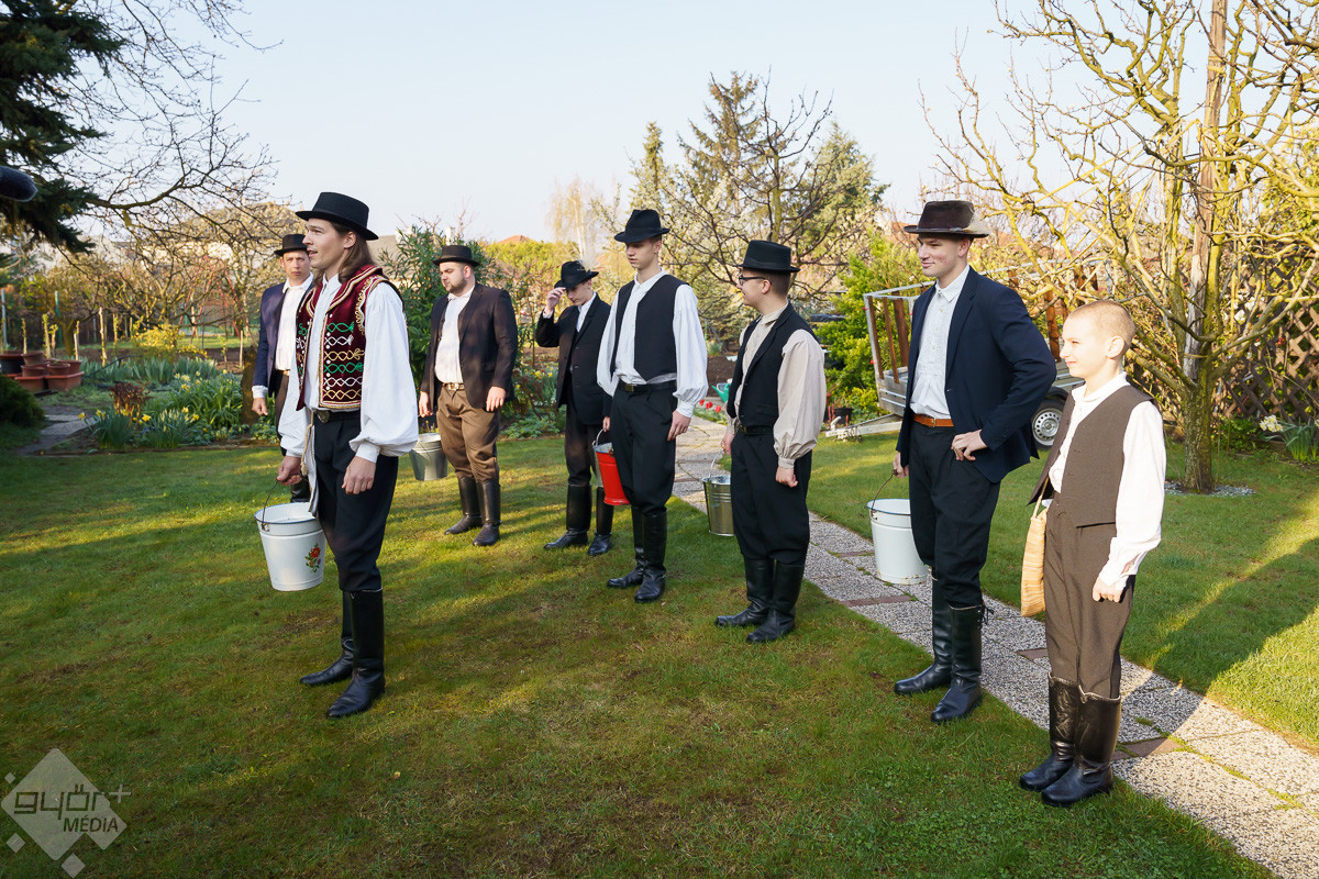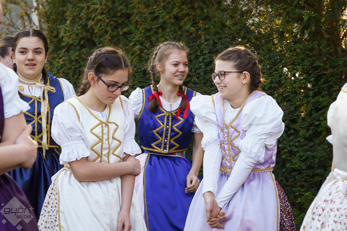 Korán reggel népviseletben várták a ménfőcsanaki Marcal Tánc -és Népművészeti Egyesület lányai a fiúkat. A legények is megfelelő öltözetben, öblös vödrökkel érkeztek, amiket kútvízzel töltöttek meg. A lányokat kiküldték az udvarra, majd a különleges locsolóvers után jó nagy adag vizet kaptak a nyakukba, így már biztosan nem hervadnak el.