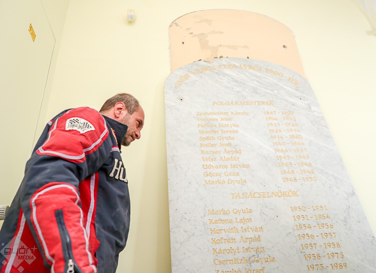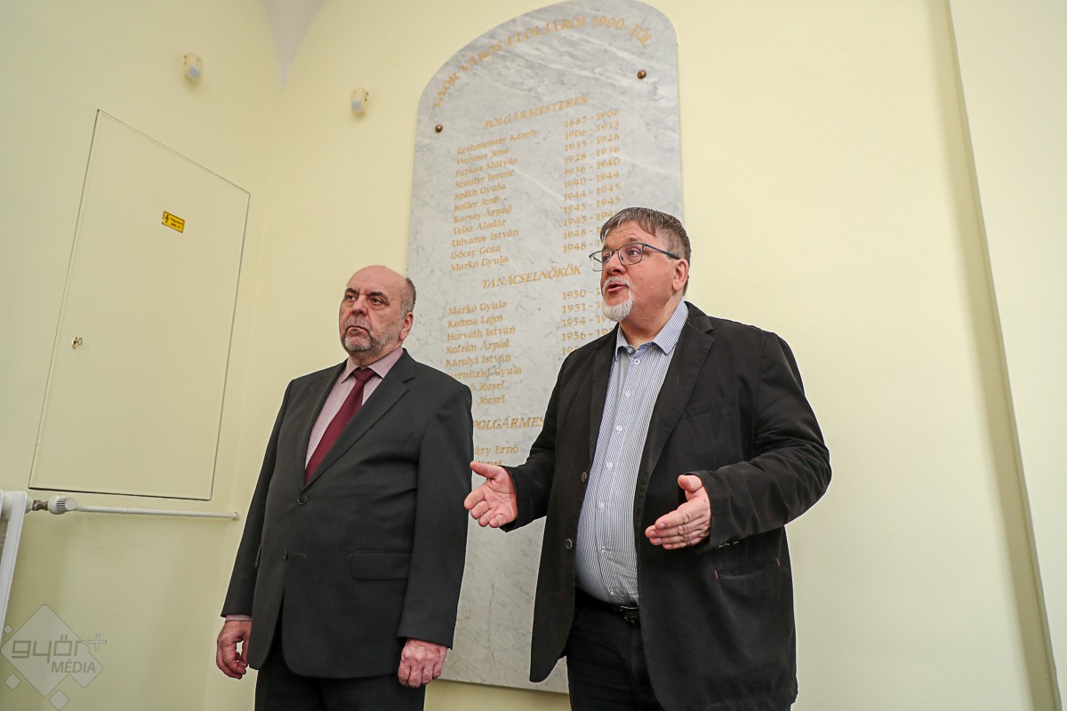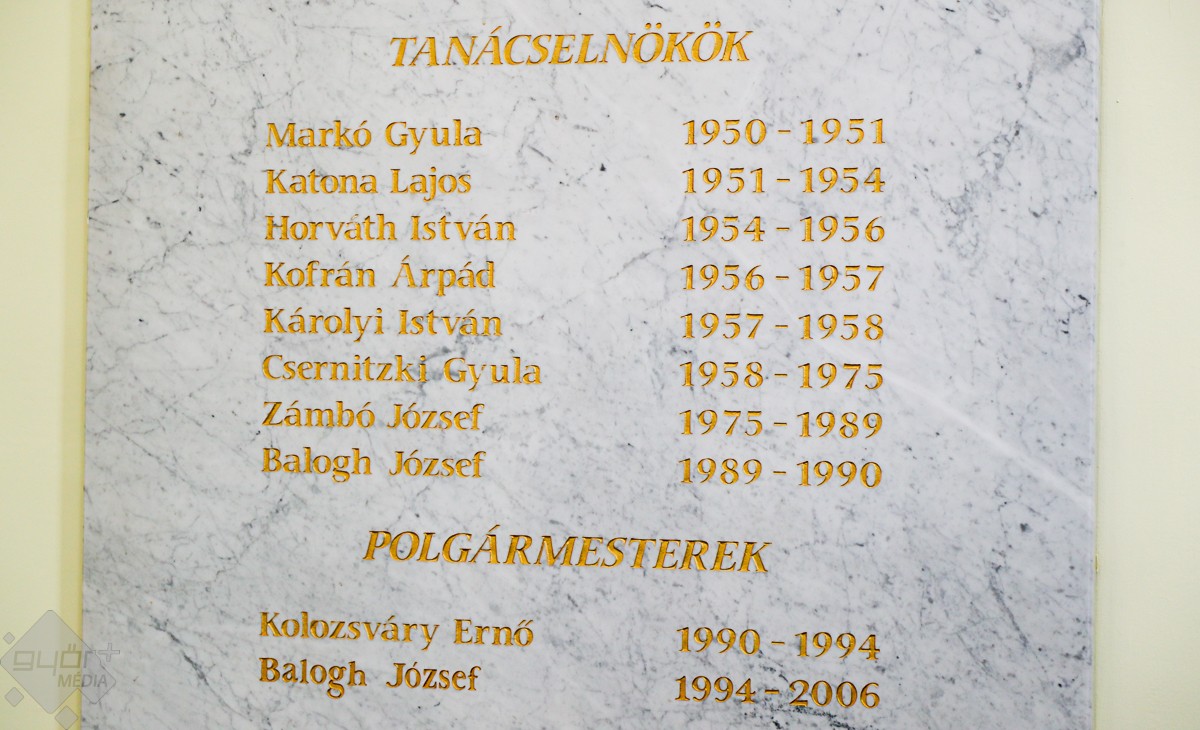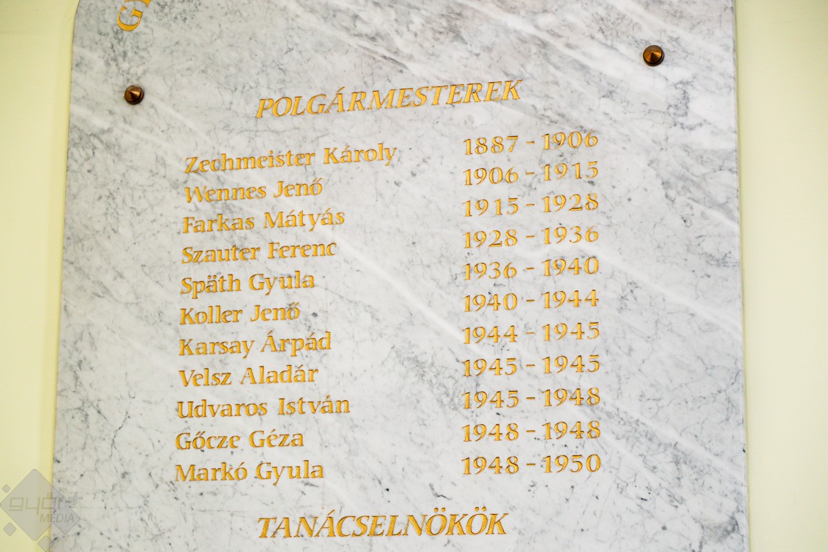 Az igazgató azt is elmondta, hogy a tábla „elődje” a régi városháza épületben, vagyis a levéltárban látható, amelyen az 1900 előtti városbírák és polgármesterek nevei szerepelnek. A városházán 1998-ban állított táblát szerdán reggel emelték le a helyéről, és a Rómer Flóris Művészeti és Történeti Múzeumba szállítják.