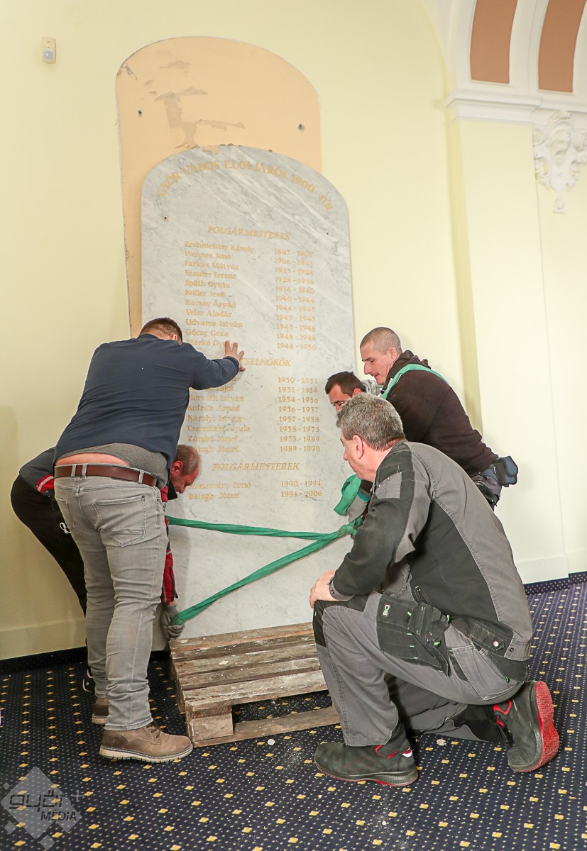 Lekerült a városházi folyosó faláról és a múzeumba szállítják azt a kőtáblát, amelyen korábbi polgármesterek és tanácselnökök nevei láthatók.