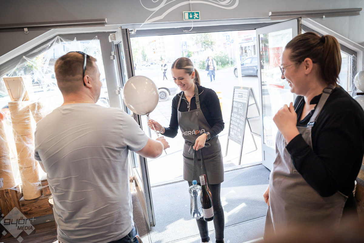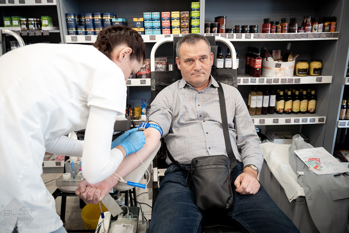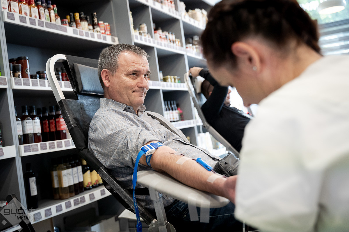 A Therápia Gourmet polcai között rendezték be az ideiglenes véradóközpontot, az ágyak pedig egy percre sem voltak üresek. Mindenki örömmel jött, hogy segítsen. Győrújfalu korábbi polgármestere, Nagy Imre Attila rendszeres véradó, így nem volt kérdés, hogy eljön. „Nagyon jó kezdeményezésnek tartom, a tavalyin is itt voltam, akkor is már nagyon tetszett. A Vöröskeresztnél nyilvántartják a véradókat, és folyamatosan kapunk sms-t vagy e-mailben értesítést arról, hogy jöhetünk a következőre. Én általában élek az összes lehetőséggel” – nyilatkozta a lelkes véradó.