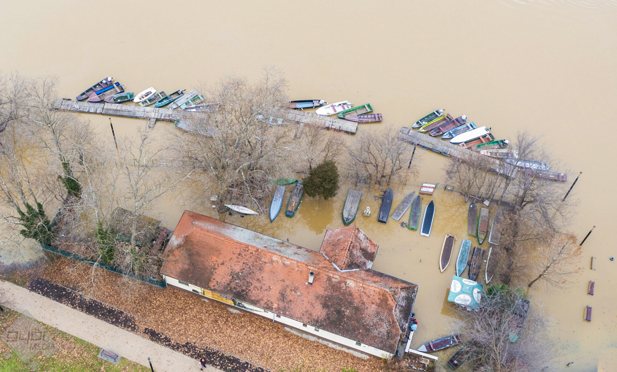 Teniszpályák a víz alatt, éppen csak a vízszint fölött maradt Radó sziget, vízáztatta falak a Püspökvárnál, színes csónakok a Mosoni-Dunán és a magasban gondtalanul repdeső madarak. Árvízi-hangulatfotók Győrből, a tetőzés napján.