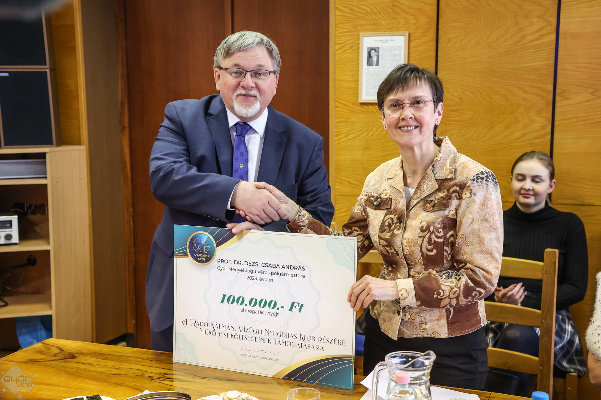 A „Beszélgess a polgármesterrel!” sorozat következő állomásaként a vízügyes nyugdíjasokhoz látogatott el dr. Dézsi Csaba András. Először átnyújtotta a százezer forintos adományt jelentő táblát a klubvezetőnek.