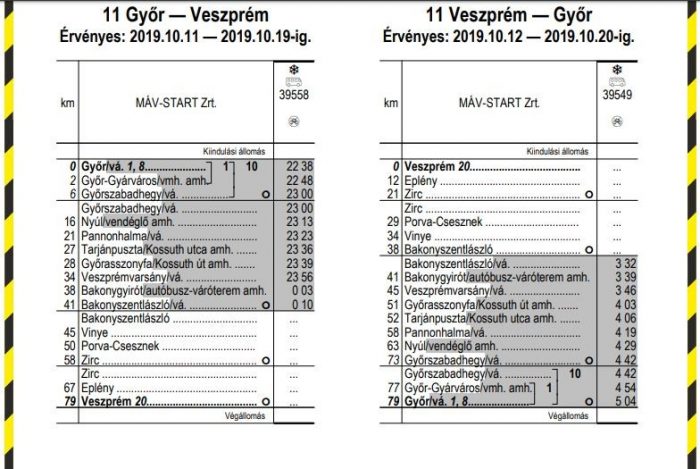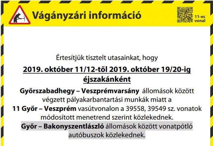 A közlemény szerint október 11-től október 20-ig a Bakonyvasút vonalán éjszakai vágányzár lép életbe, mely során a Győrből 22:38-kor és Bakonyszentlászlóról hajnali 4-kor induló vonatok helyett pótlóbuszok közlekednek .