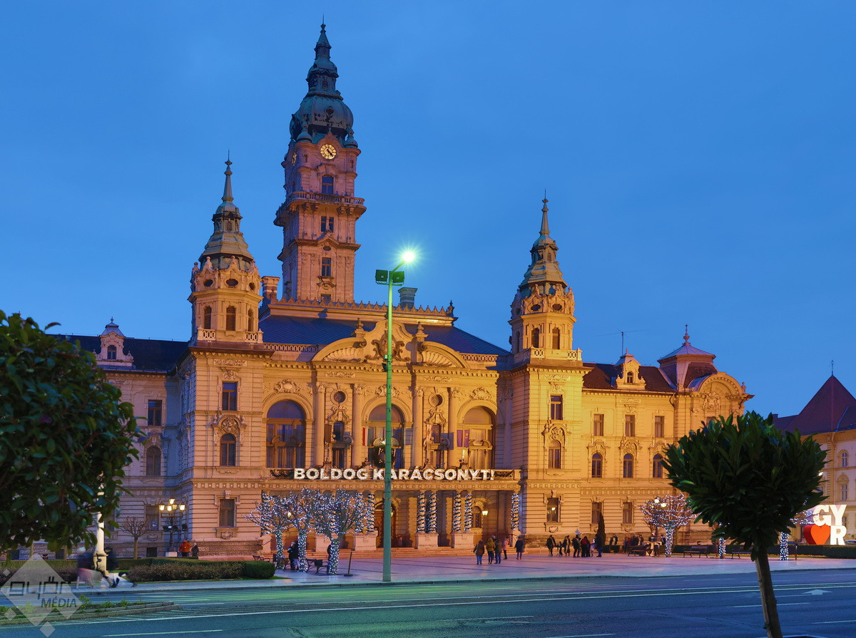 A Városháza épülete is kapott karácsonyi díszeket és a korábban megszokott felirat is díszíti már a homlokzatot.