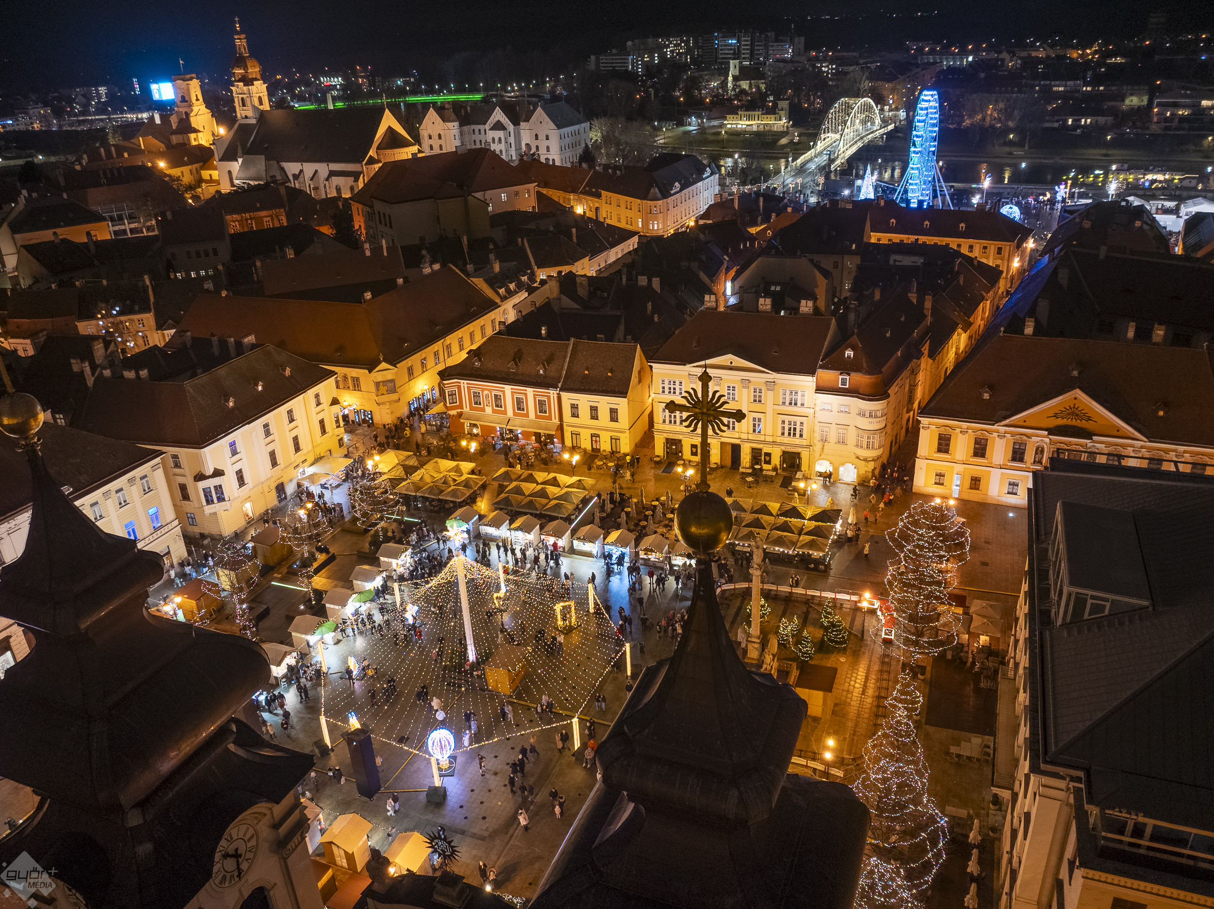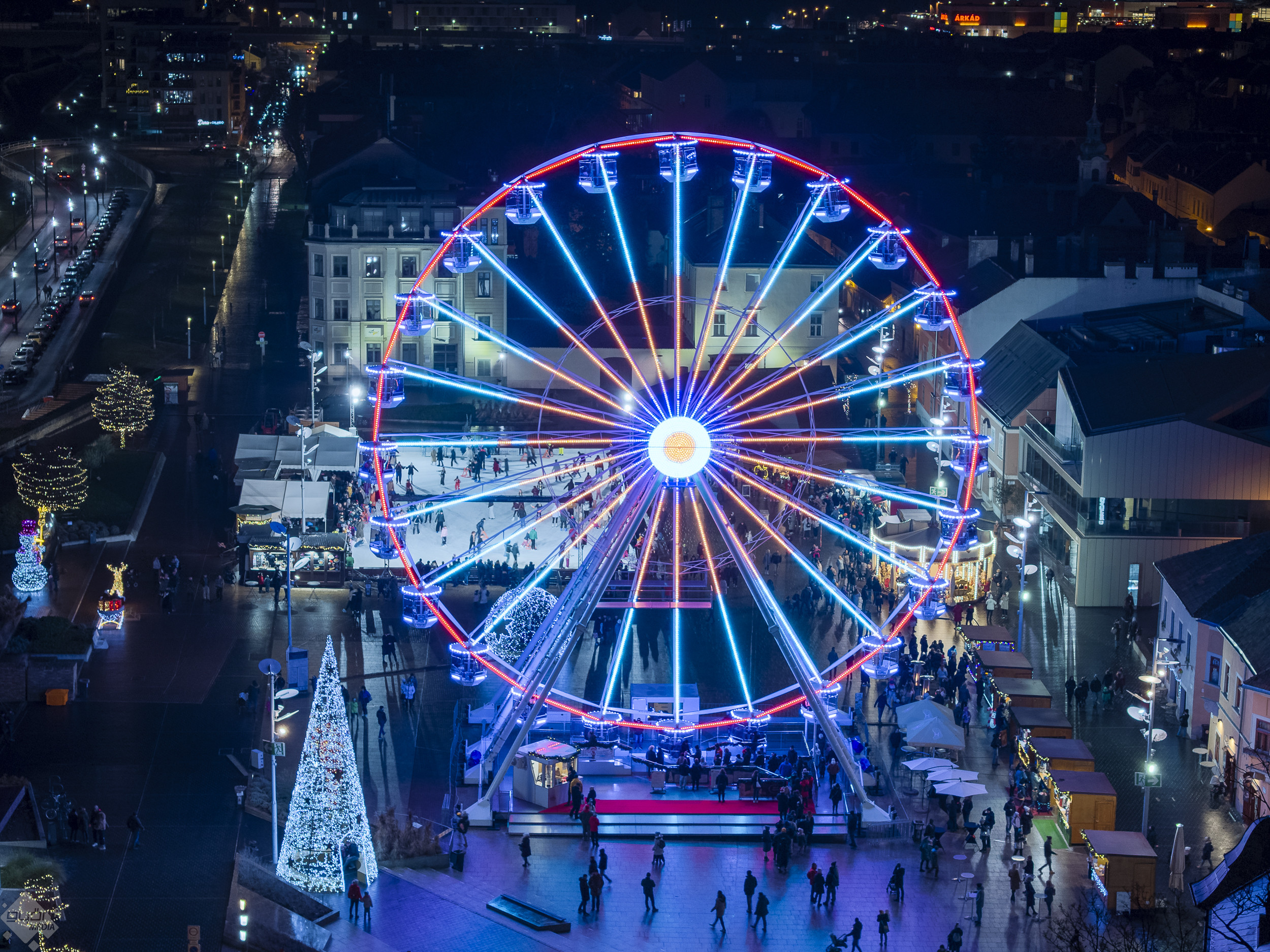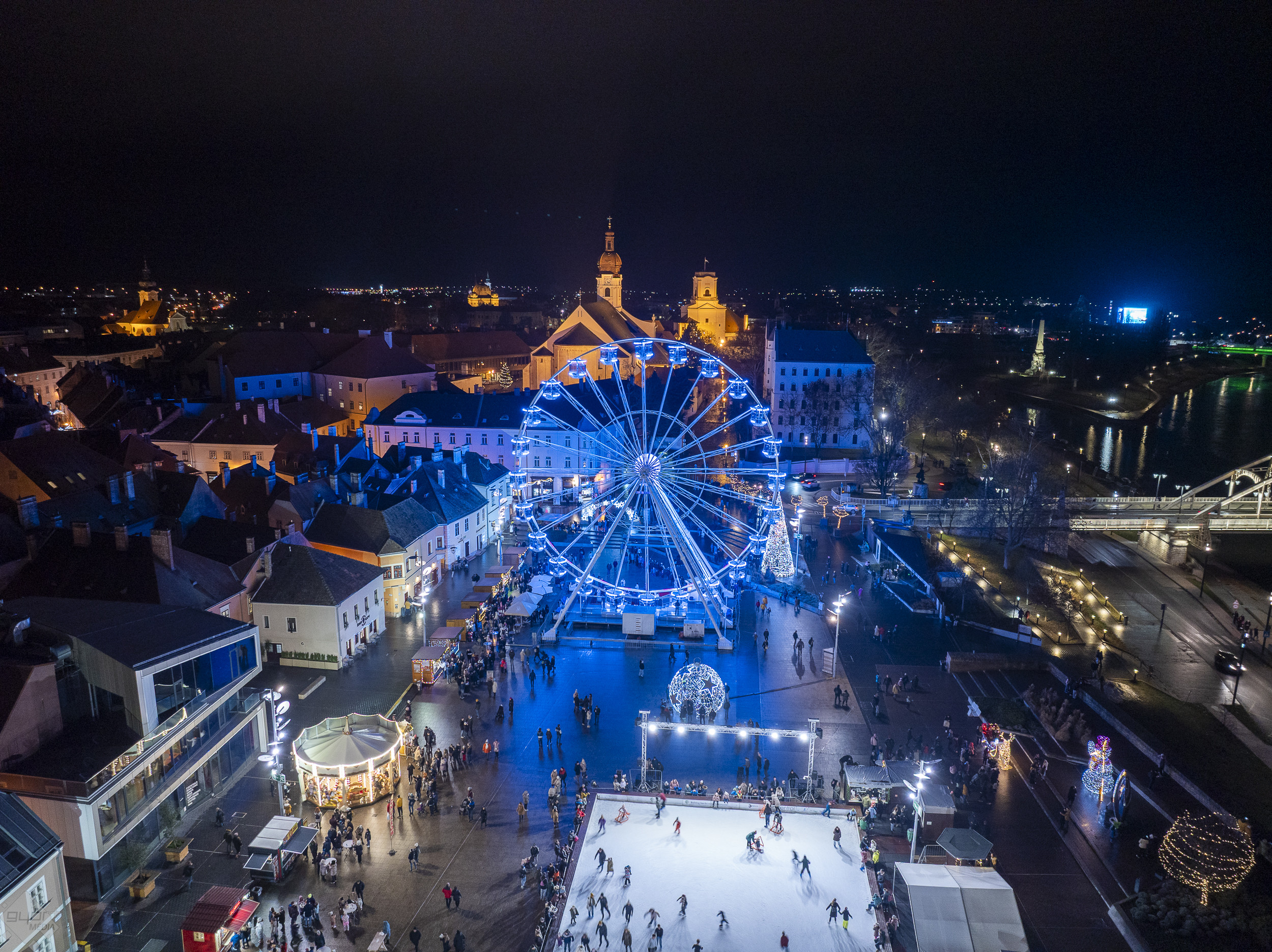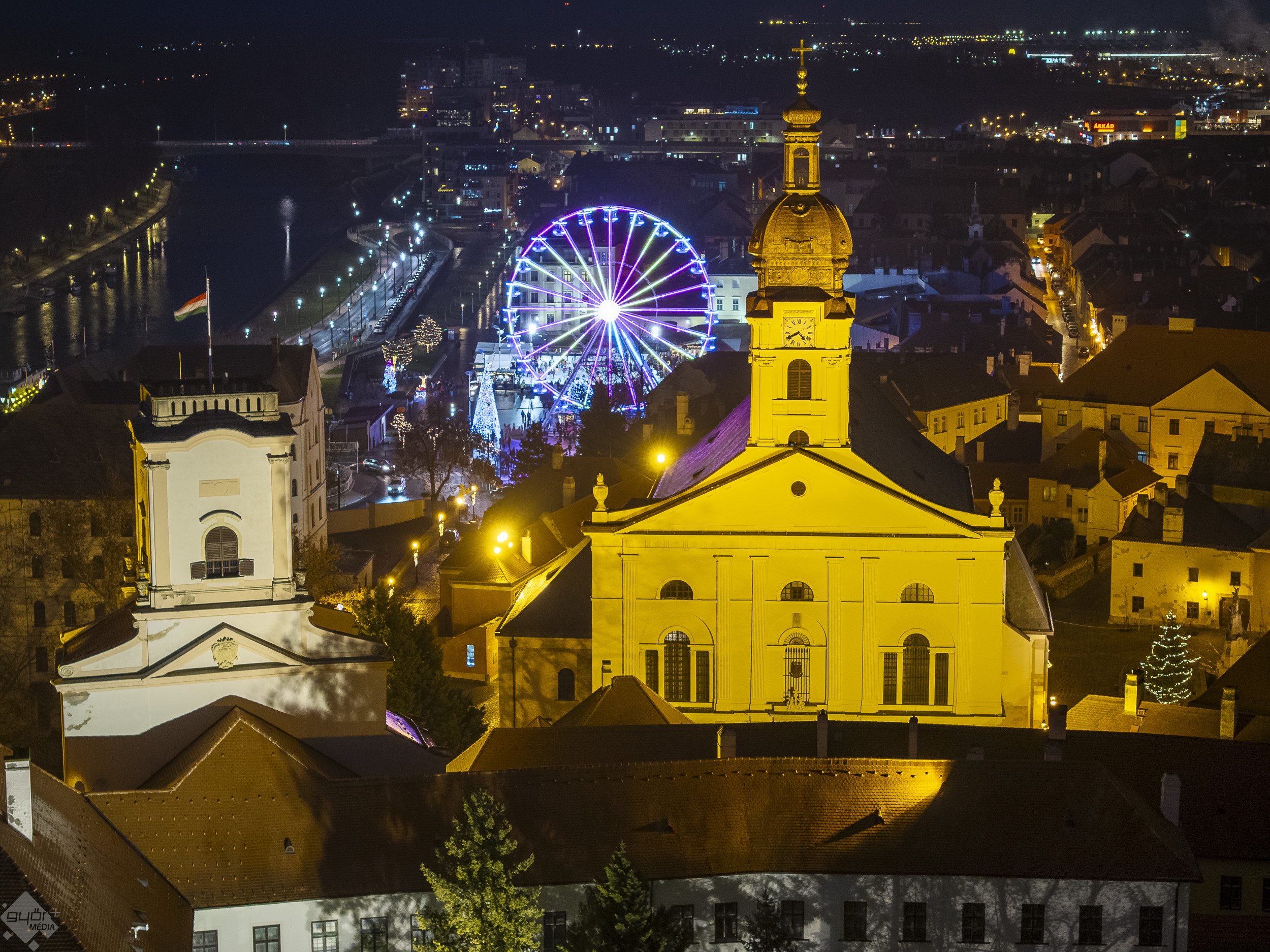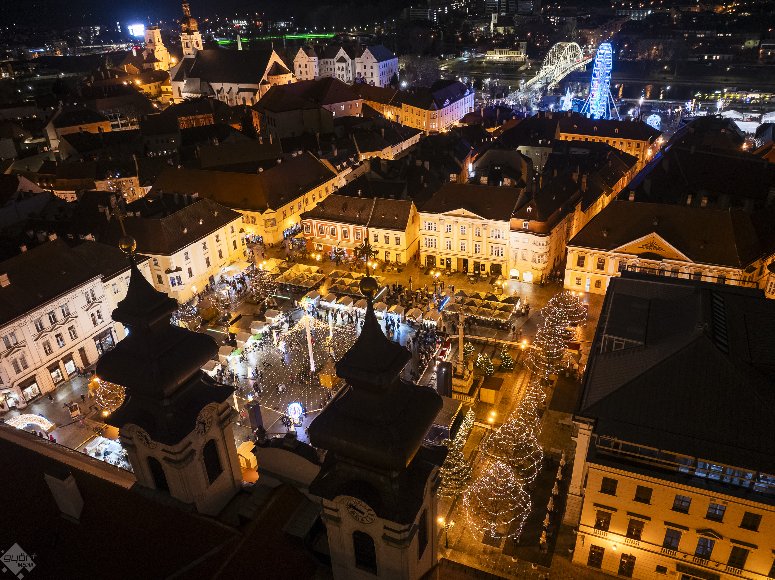 Ennél különlegesebb atmoszférát nehéz elképzelni: gyönyörű díszkivilágítás, fényfüzérektől ragyogó terek, ezer színben pompázó óriáskerék és persze az adventi vásár kis házikói, amelyek estéről estére karácsonyi csodával hintik be a belváros időtlen szépségét. Fentről nézve az ünnepekre készülődő Győr elképesztő látványt nyújt – és olyan arcát mutatja, amelyet ritkán van alkalmunk megcsodálni.