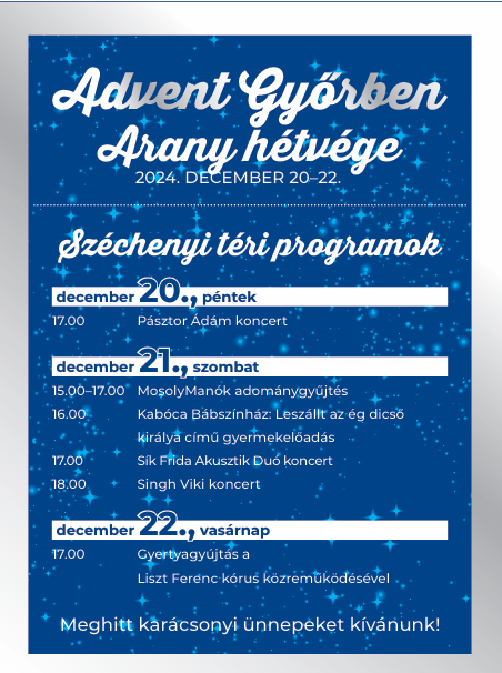 - Fényfestés a Széchenyi téren december 23-ig. Hétfő–csütörtök: 17.00, 18.00, 19.00 és 20.00, péntek: 17.00, 18.00, 19.00, 20.00 és 21.00, szombat: 17.00, 18.00, 20.00 és 21.00, vasárnap: 17.00, 18.00, 20.00 és 21.00.